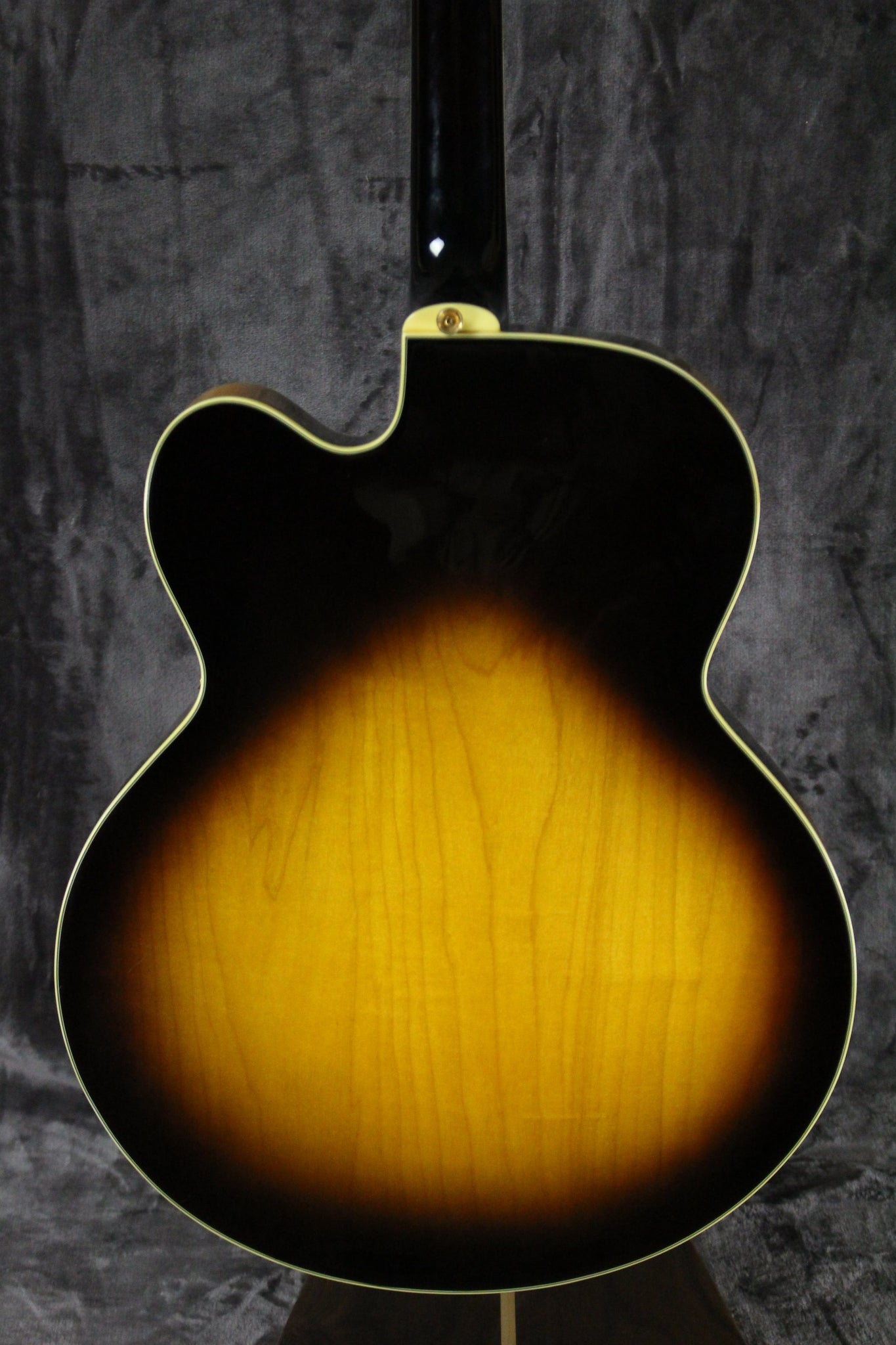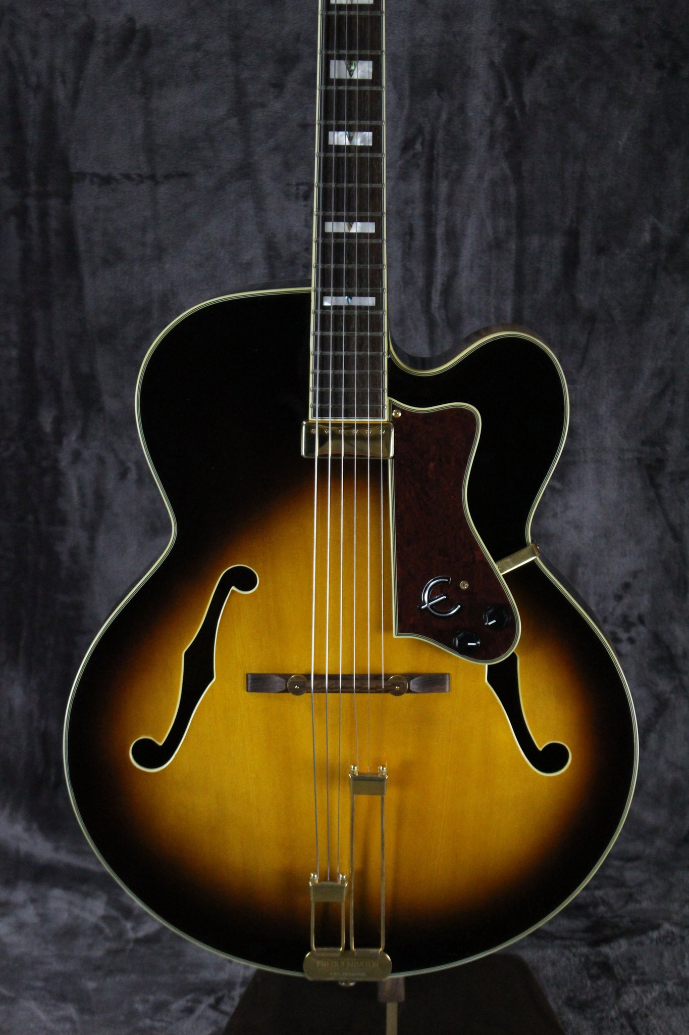 This 2004 Epiphone Emperor features a Spruce top in Antique Sunburst, a single floating mini-humbucker, V-Block inlays, and a frequensator tailpiece.