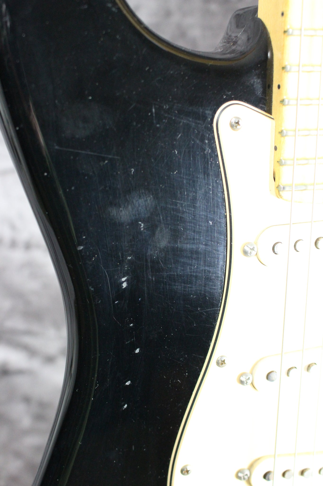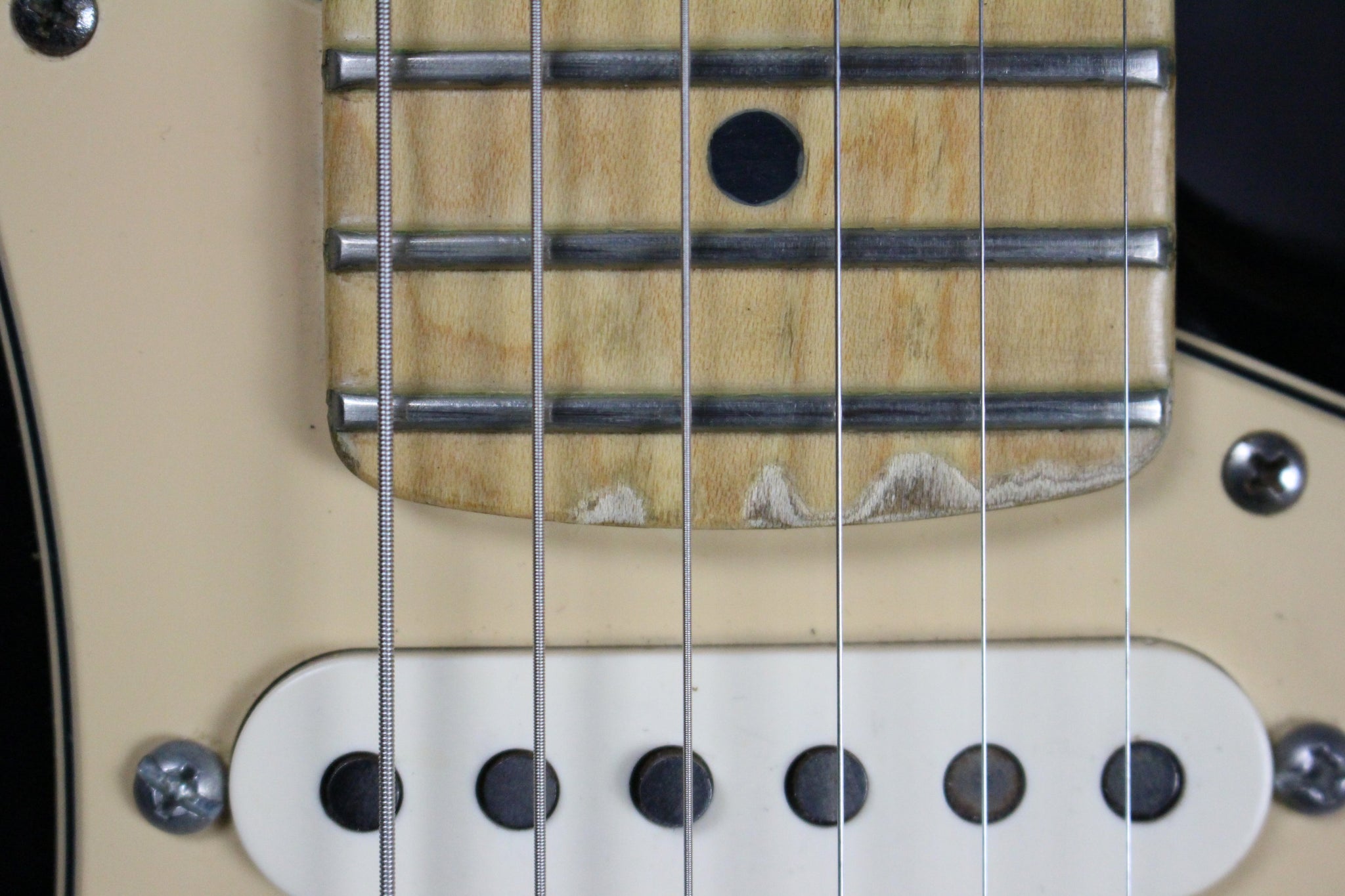 Cosmetics: The finish on this guitar has started to chip off in areas. There is some wear after the 22nd from probably pick wear (See Photos Please). It has light surface scratches and a few dings here and there on the body. The pickguard has regular wear. The back of the neck has light indentations throughout. The backplate has been removed. The frets have light wear. Overall, this guitar has some cosmetic issue but still plays great and sounds fantastic.