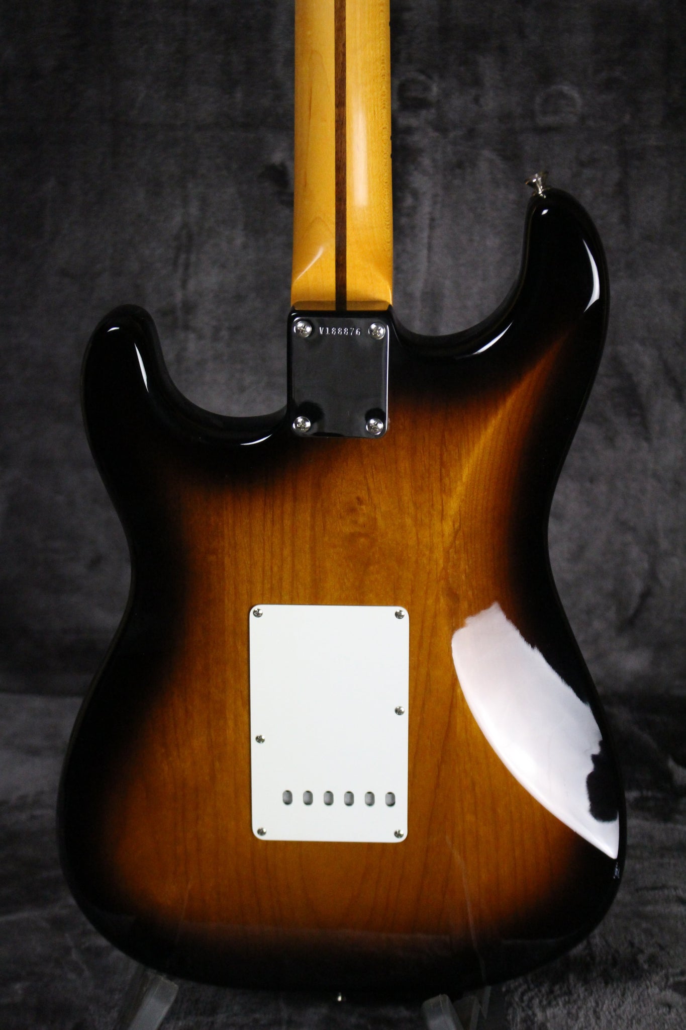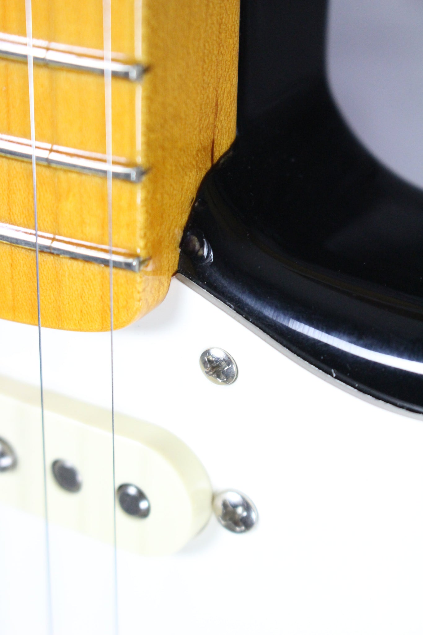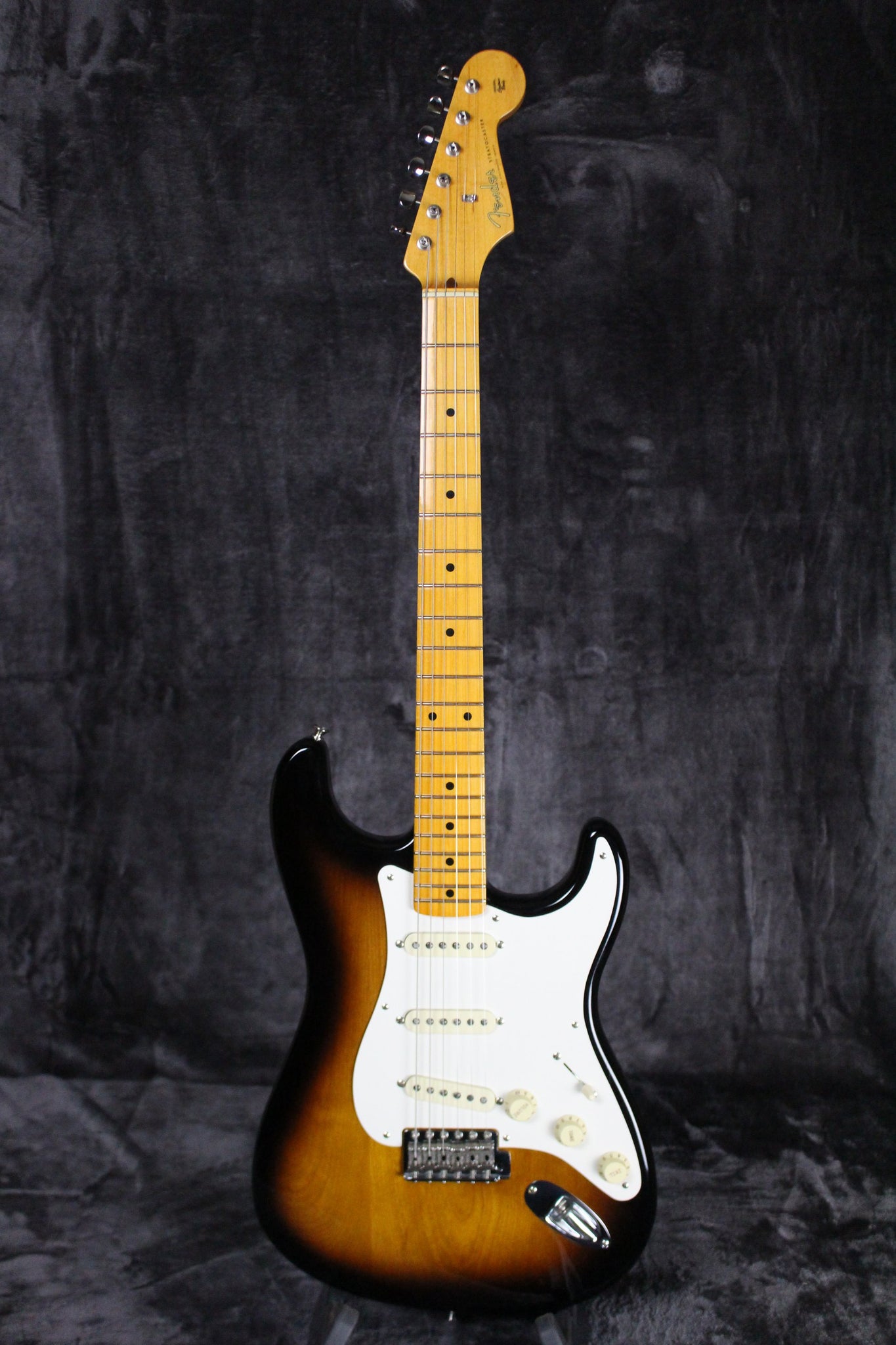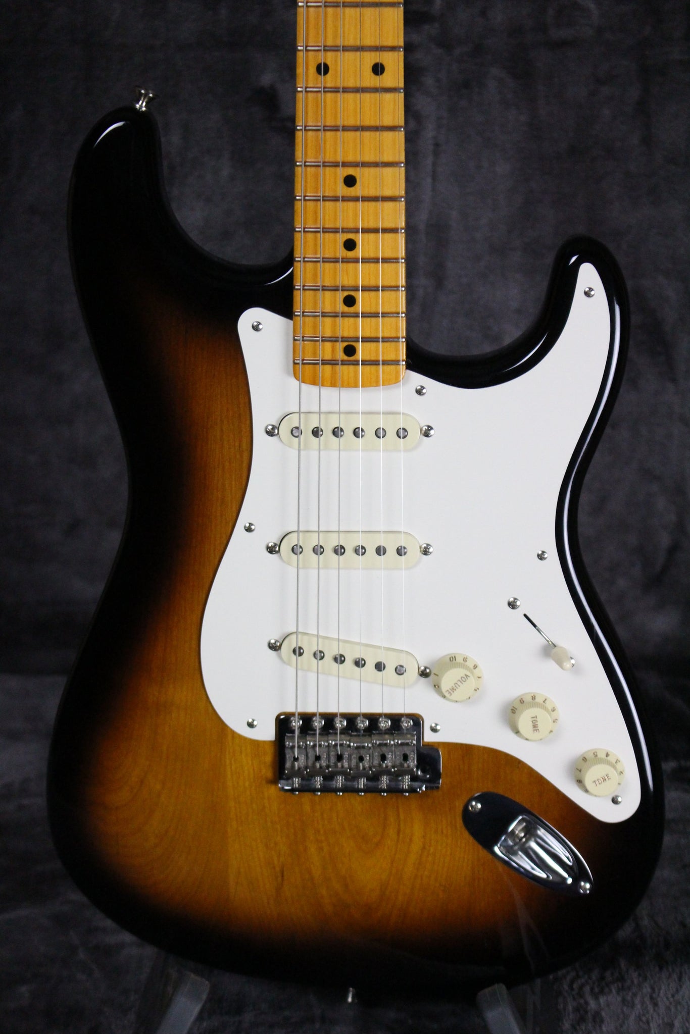 Summary: One of the most popular instruments in history, the Fender Stratocaster is the most imitated electric guitar ever. 1957 was a landmark year for the instrument; it had evolved from its early incarnations into an archetype, and it was the high point of the maple-neck era. Features include an alder body, American Vintage single-coil pickups, five-way switch, beveled pickup magnets, and a single-ply pickguard.
