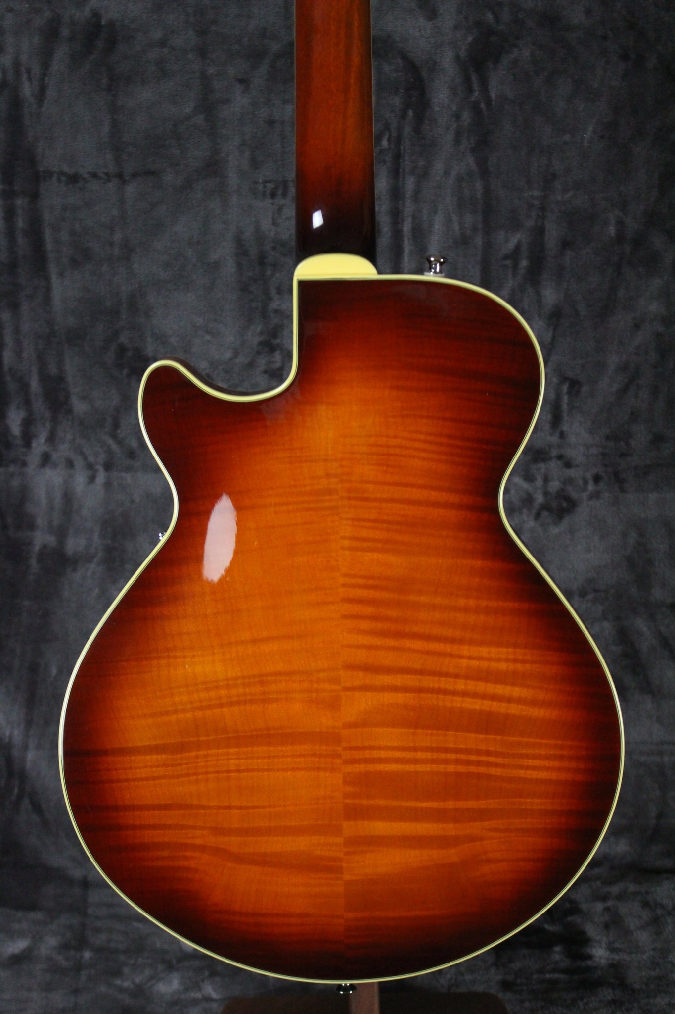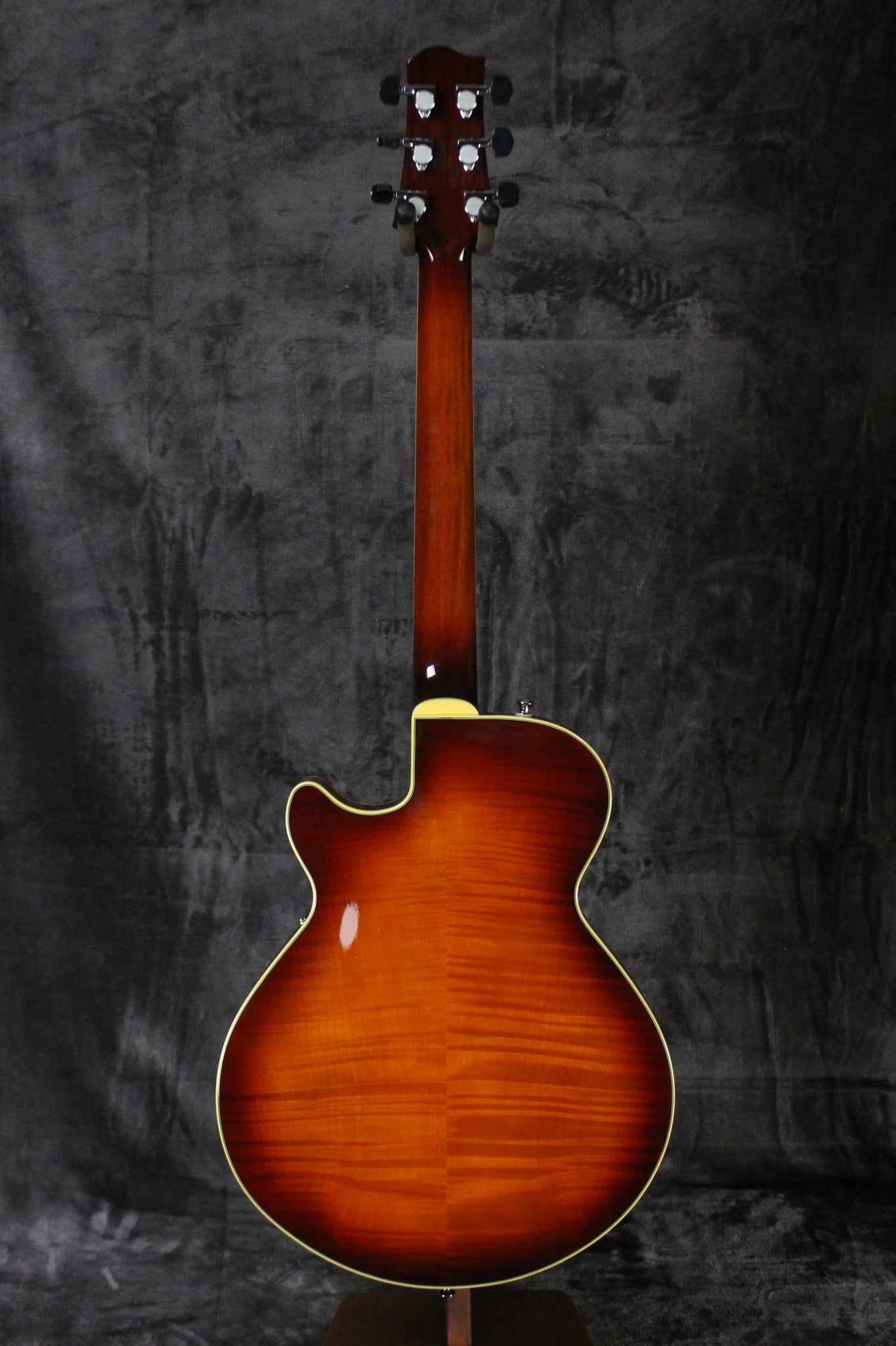 Body: 15" body width at lower bout, 5-ply flamed maple laminate with chambered spruce center block, 1 3/4" body depth, with scraped binding in Sienna Burst finish.