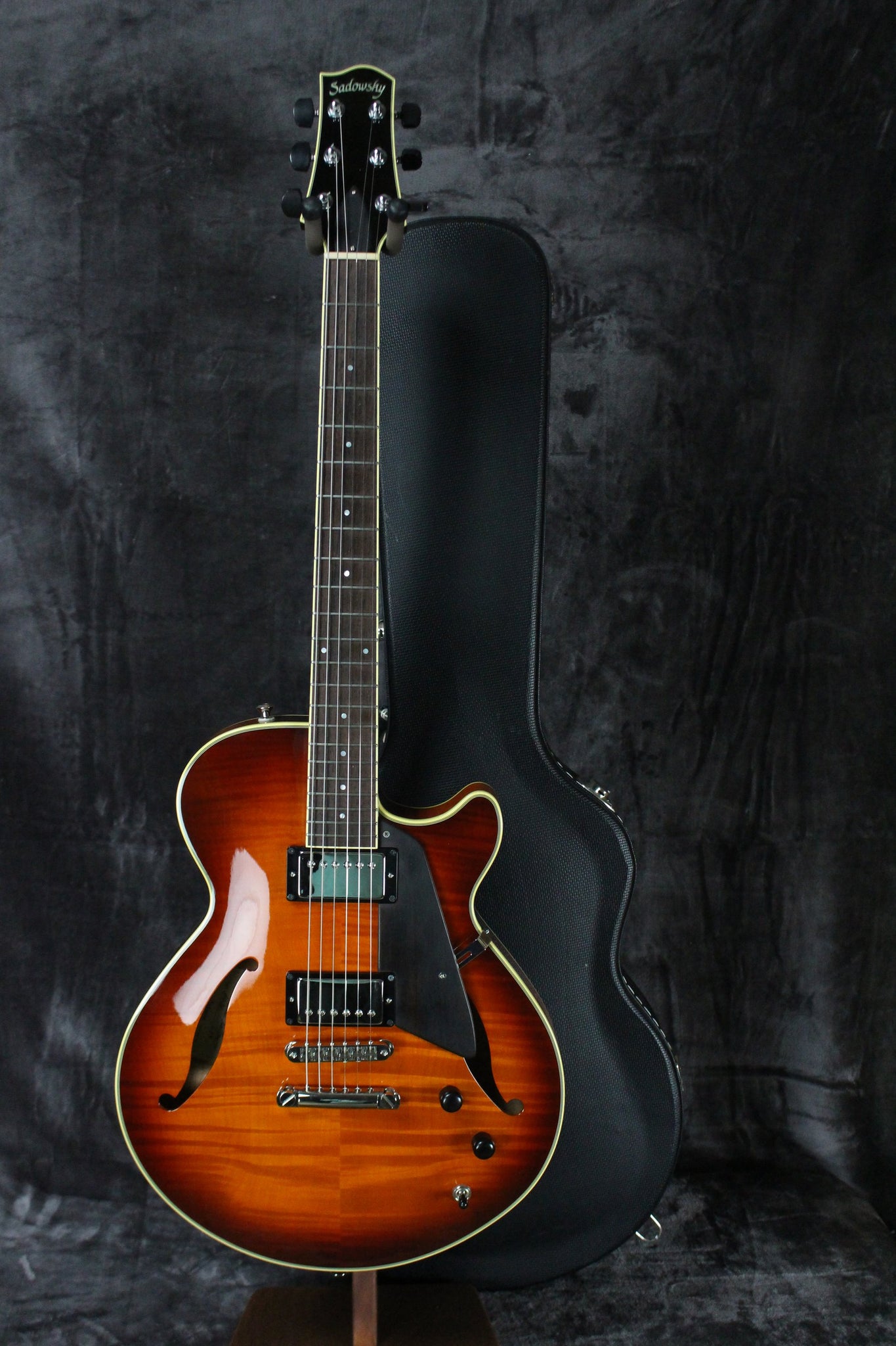 This 2009 Sadowsky Archtop Semi Hollow is constructed of highly flamed 5-ply arched Maple, specifically crafted to optimize amplified tone while suppressing feedback. The thinline version of the popular Jimmy Bruno model, the Semi-Hollow is a delight to hold, and a breeze to tote to the gig. The gentle D neck profile is particularly inviting, and the smooth fretwork on the solid Amazon Rosewood fingerboard board all make for an exceptionally nimble playing experience. Advanced design features include the extended cutaway body for enhanced fret access, and the chambered body, much lighter than conventional slimline guitars.