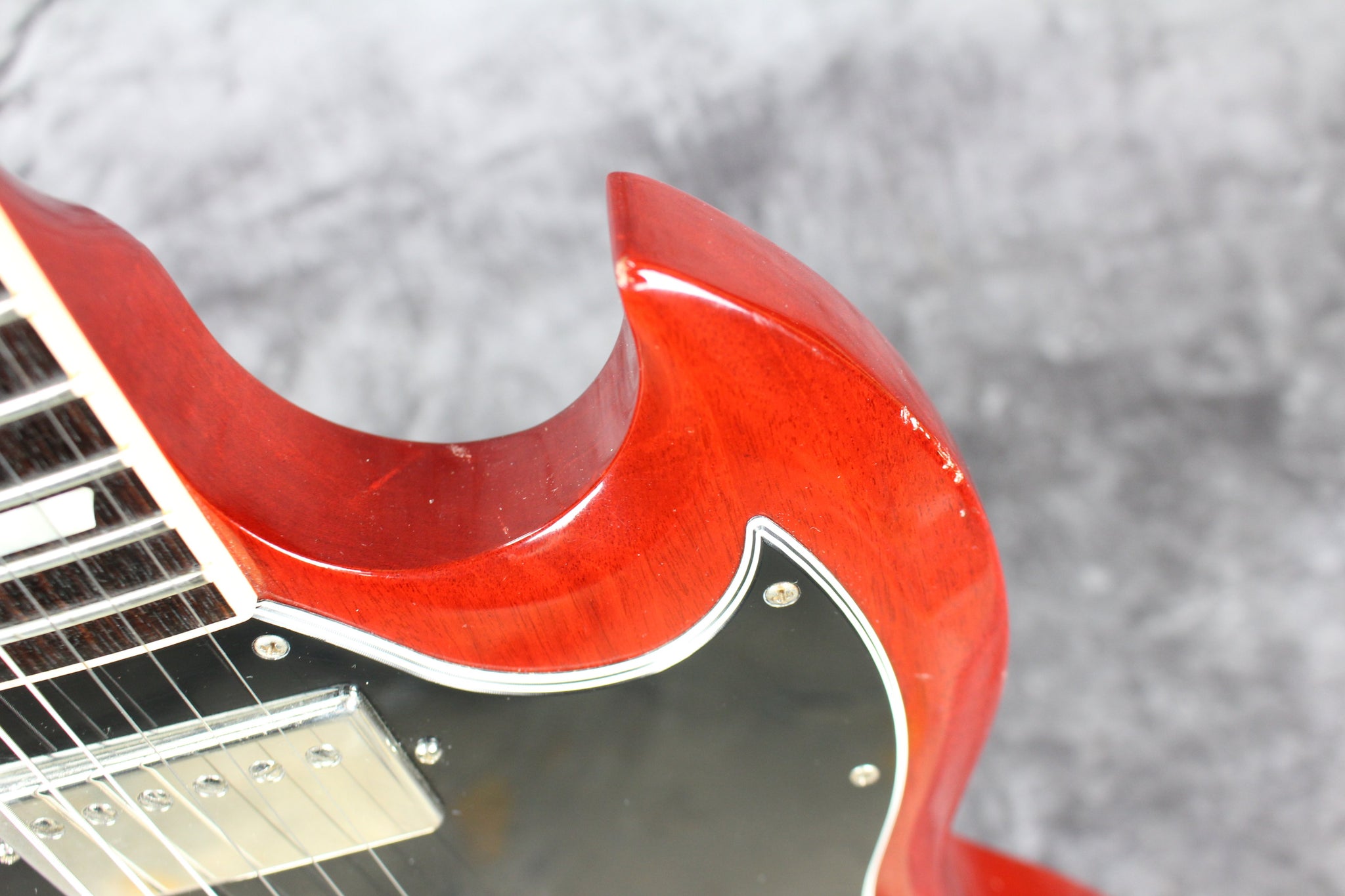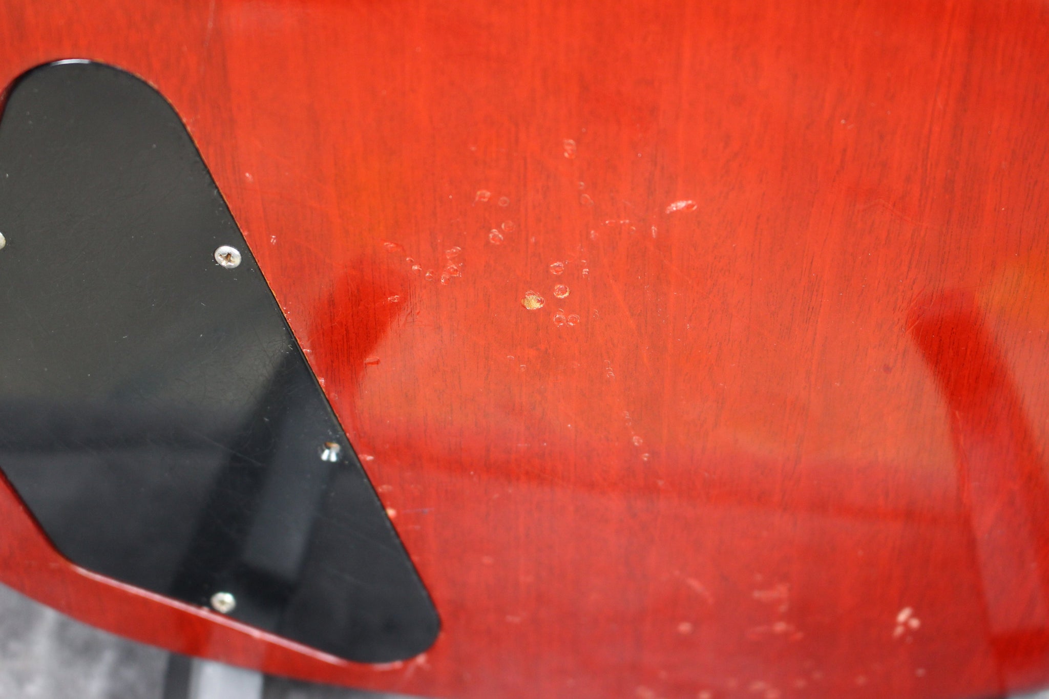 Cosmetics: This guitar has small scratches and dents on most of the body. The pickguard has regular pick wear. The neck has a few scratches and dents. Overall, this guitar has been gigged with but plays and feels great.