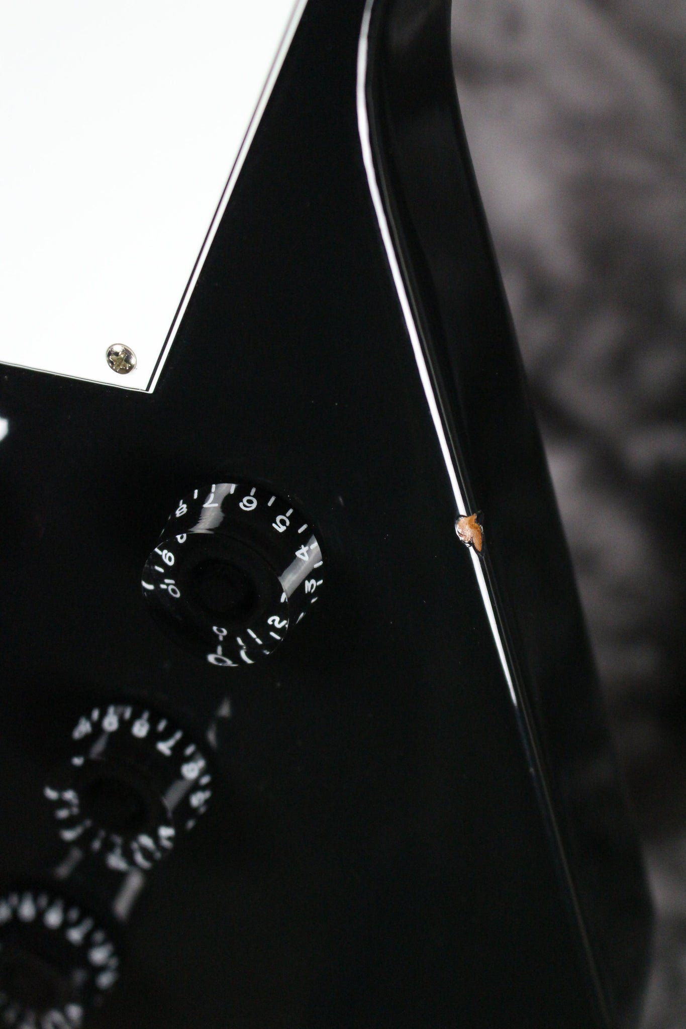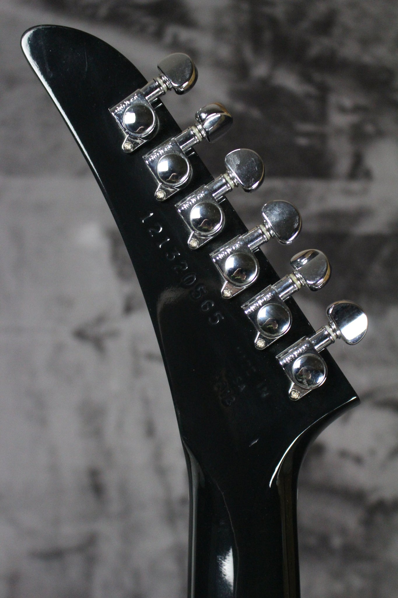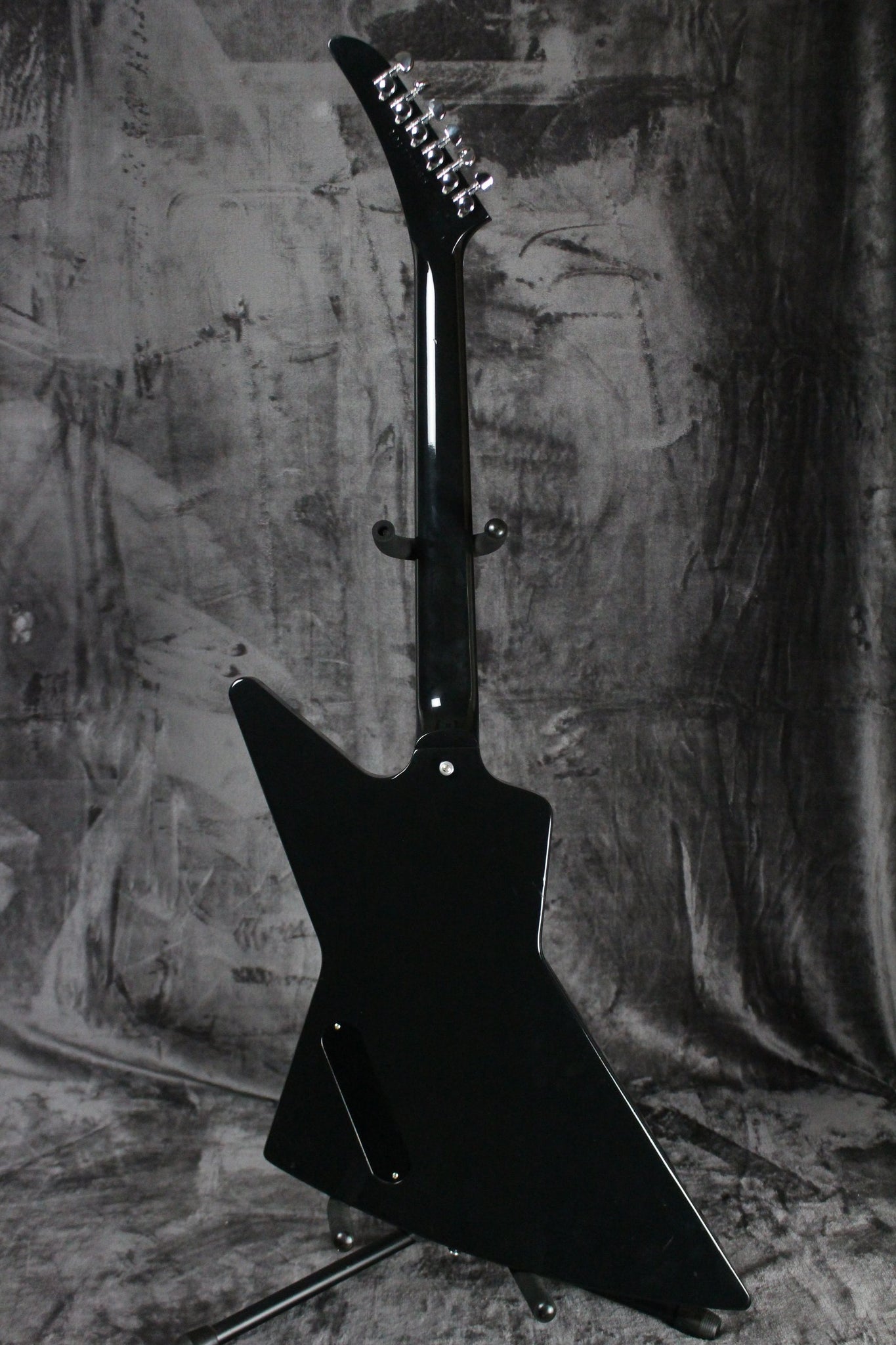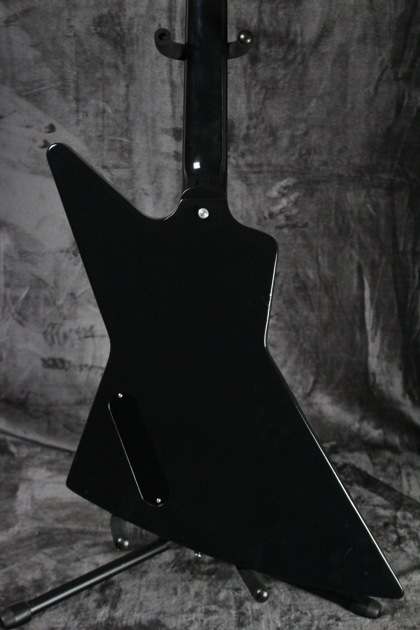 Summary: After a decade of rapid revisions and tiers of the Explorer, Gibson went back to its roots in 1990, pulling the new Explorer's design from the original 1976 re-release. This design would remain in production under various names until the mid-2010s. This Explorer was built in 2012, has an ebony finish, two hot Gibson humbuckers, and the Grover tuning keys provide great tuning stability.