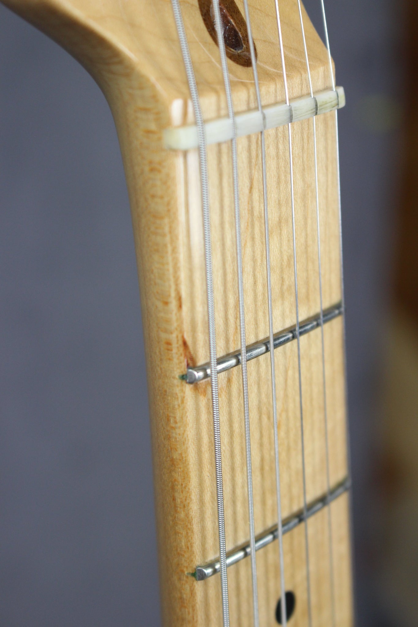 Neck: Modern “Deep C” maple with satin urethane finish on the back, gloss urethane headstock face, 25.5” scale length, 1.707” nut width, narrow tall frets, bone nut, black dot inlays, Bi-flex truss rod.