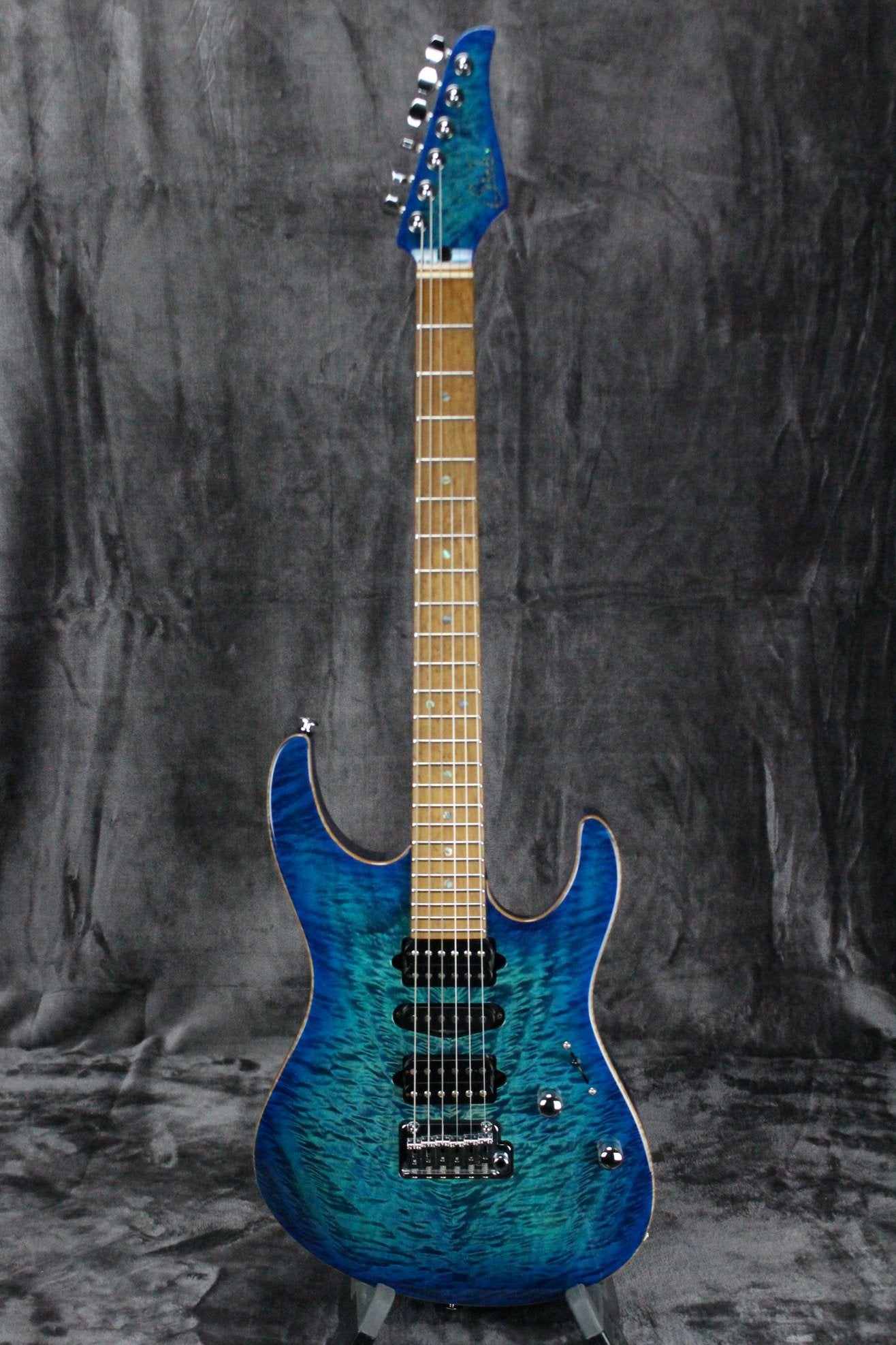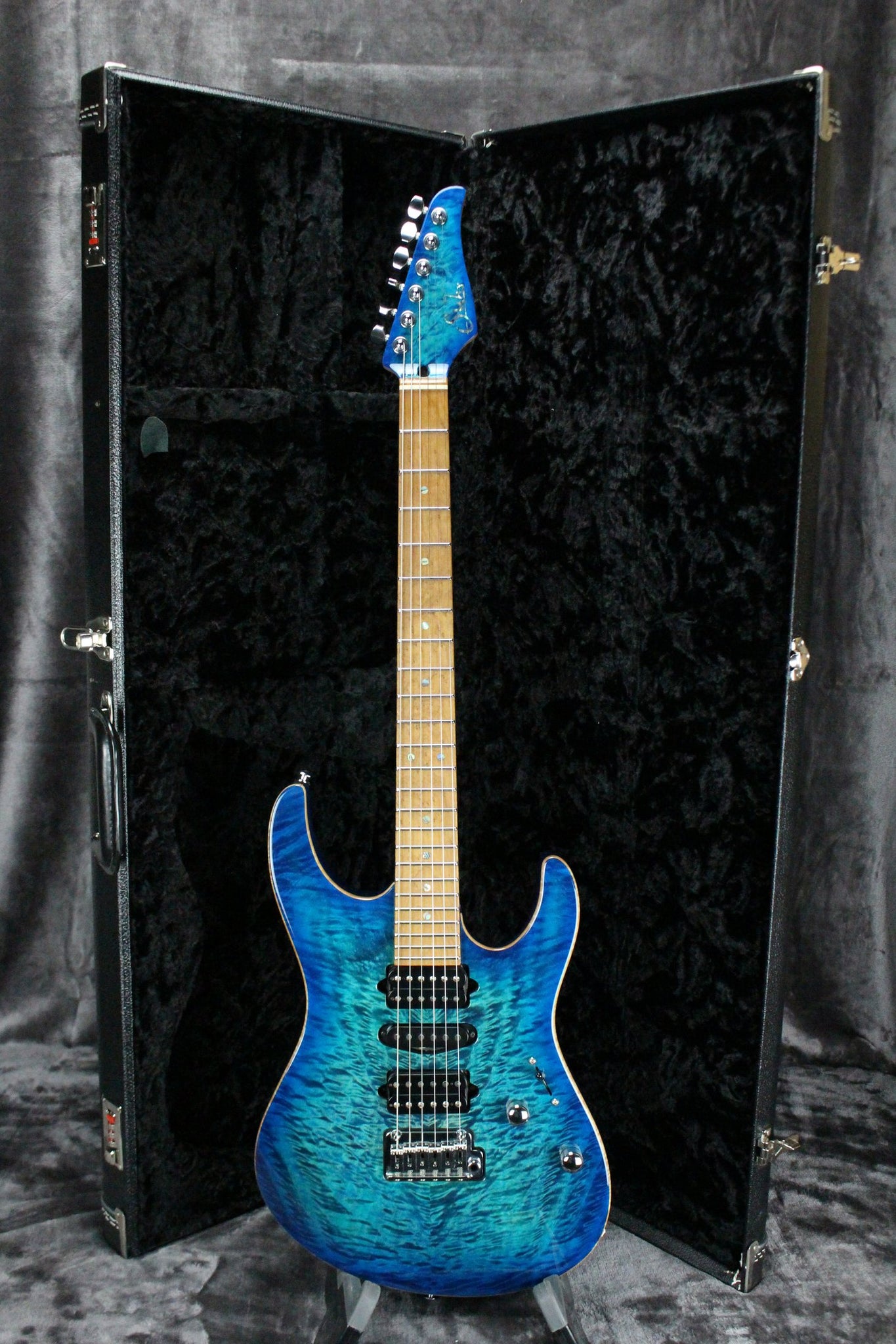 Summary: This Modern features a Roasted Maple neck with a 3A Roasted Birdseye Maple fingerboard. This Modern has specifications including the sleek elliptical neck profile, balanced asymmetrical 2-piece White Limba body, innovative neck heel and a stunning 2-piece Angel Quilt Maple top finished in an Aqua Blue Burst. The Suhr locking tuners and the Gotoh 510 tremolo provides superior tuning stability.
