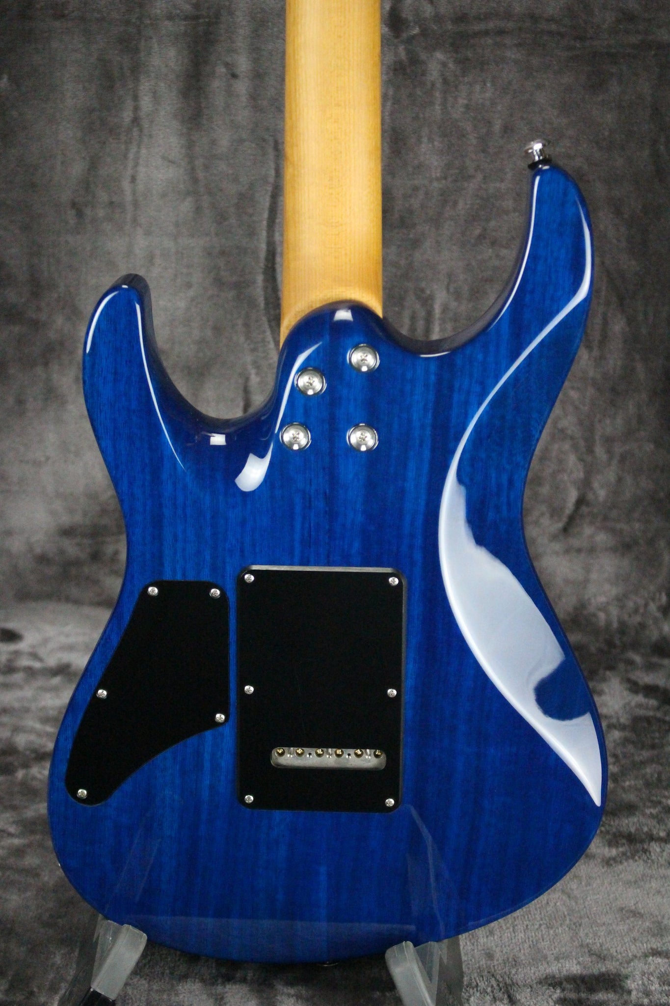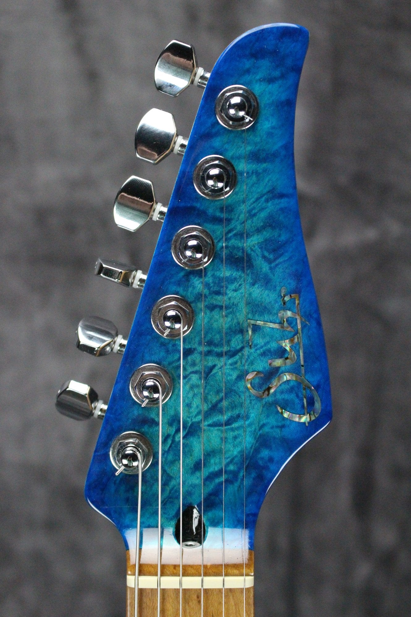 Body: 2-piece White Limba with a 2-piece 3/16” Angel Quilt Maple top finished in a gloss Aqua Blue Burst.