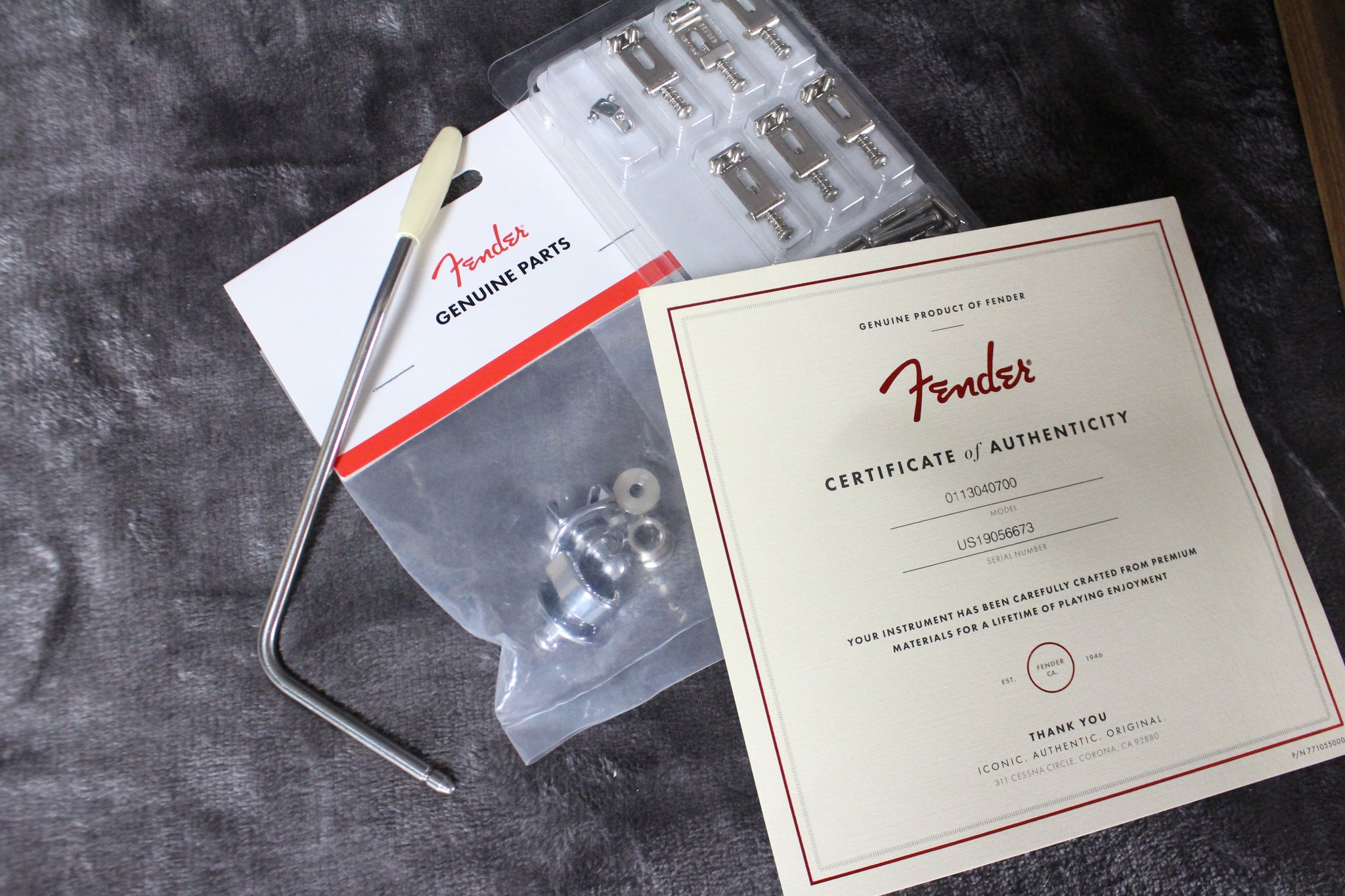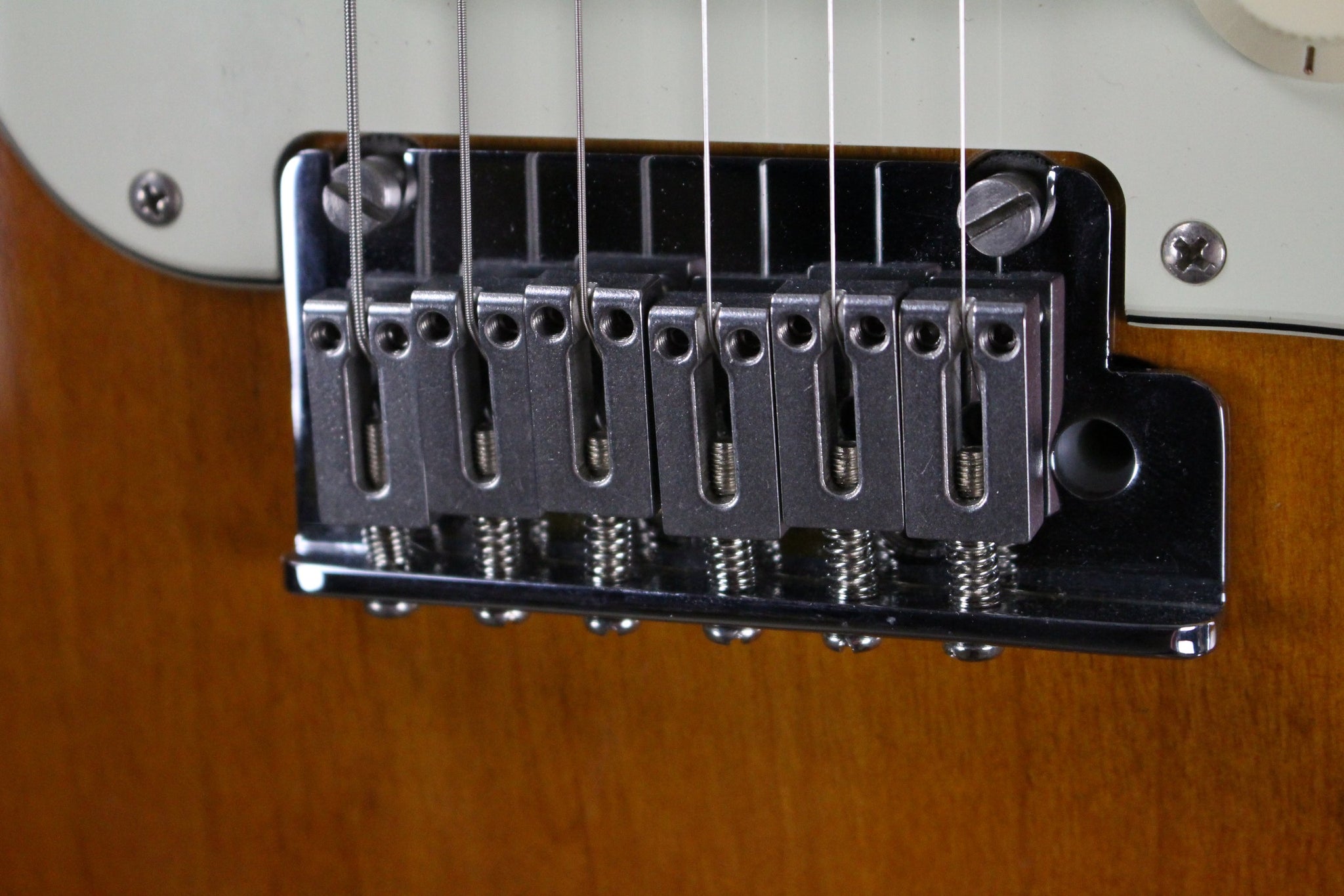 2-point synchronized tremolo with replaced block saddles, aged white plastic knobs, bone nut, Graphtech string tree.
