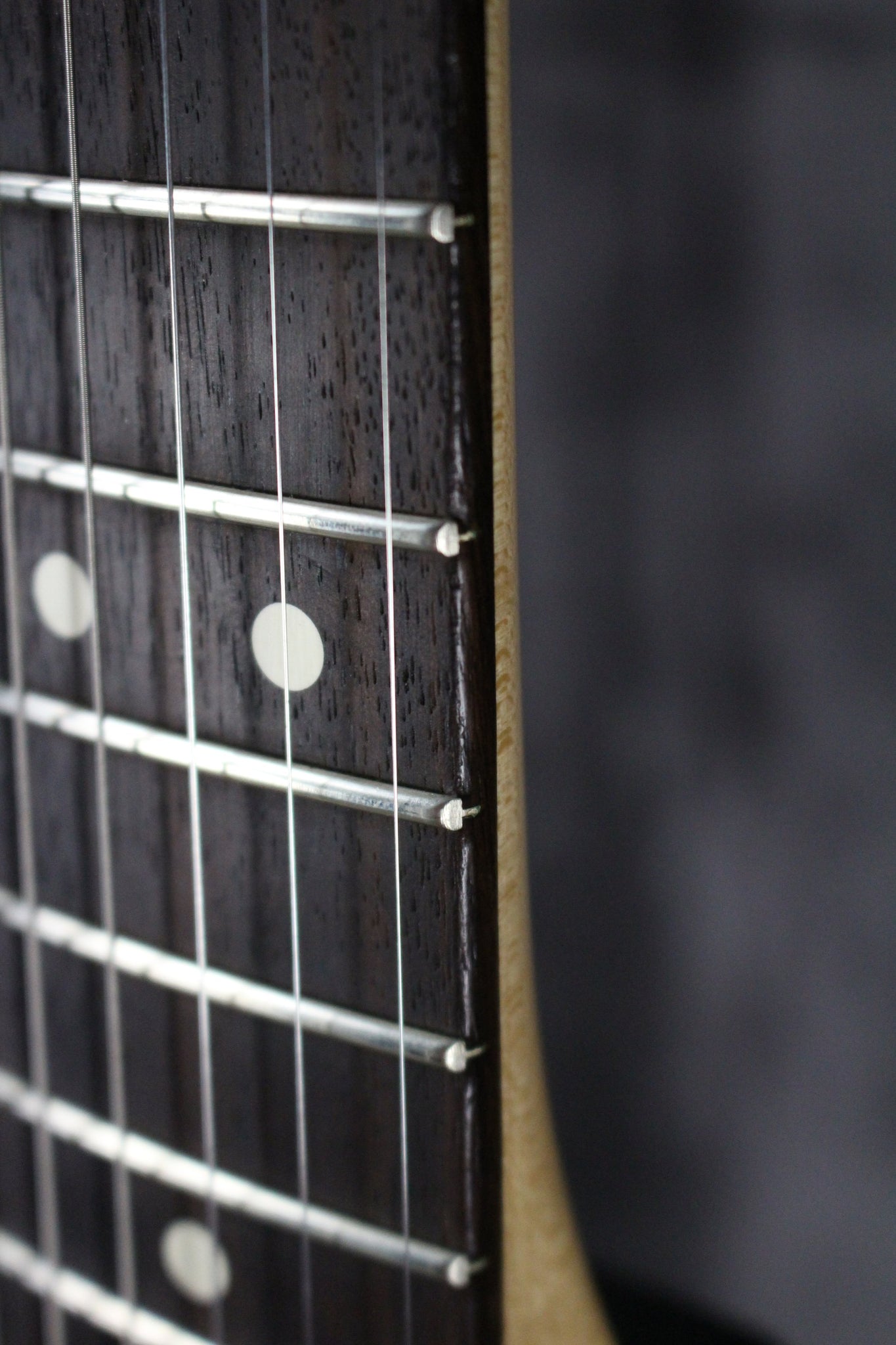 Neck: Modern “Deep C” profile maple neck with a Rosewood fingerboard, 9.5” radius, 25.5” scale length, 1.685” nut width, 22 frets, white dot inlays.