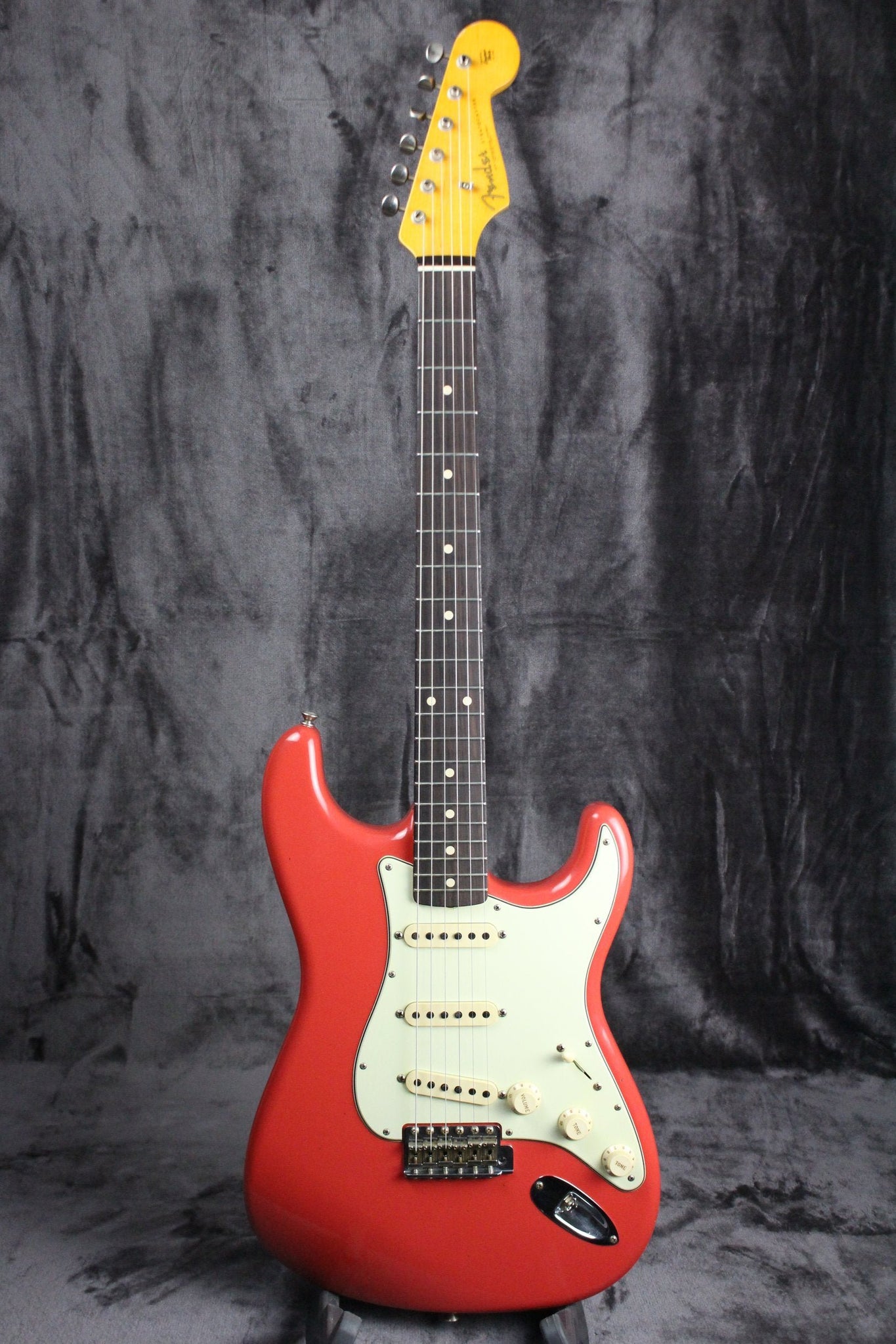 Pickups/Hardware: Three hand-wound WW10 Strat single coil pickups, vintage style tuning keys, master volume/two tone controls/5-way pickup selector, American Vintage 6-saddle bridge, Vintage Modified wiring #2, 3-ply mint green pickguard.