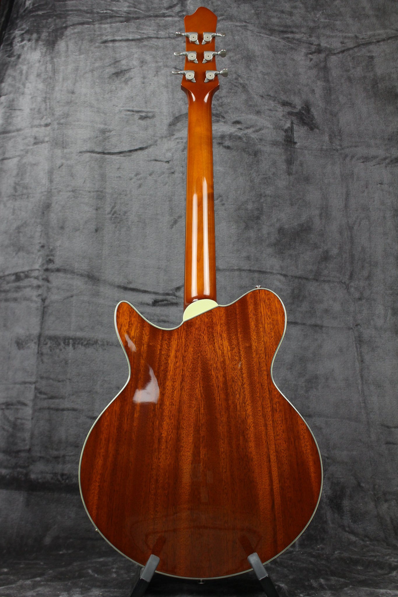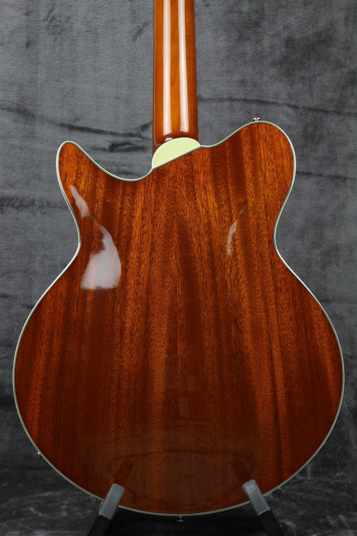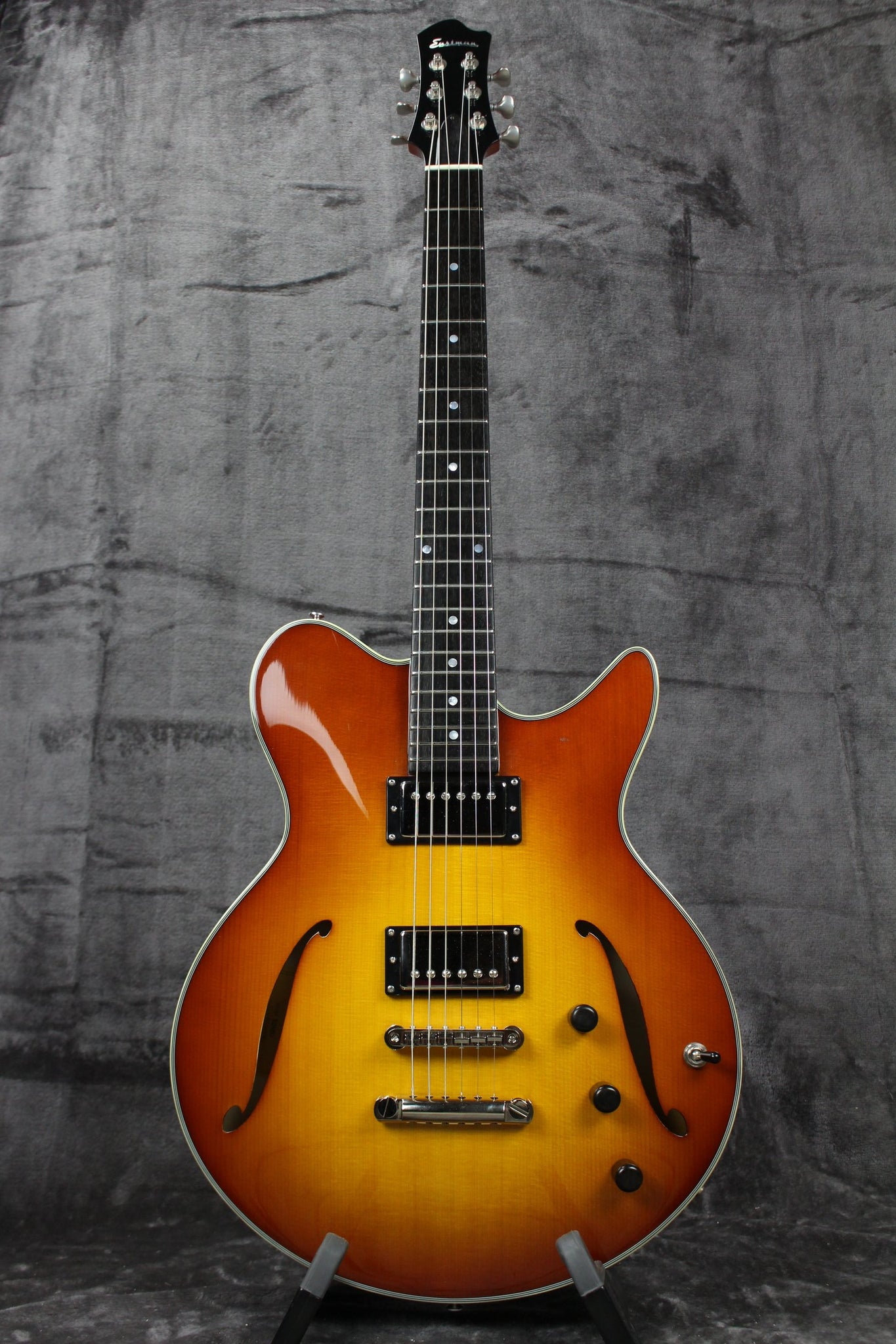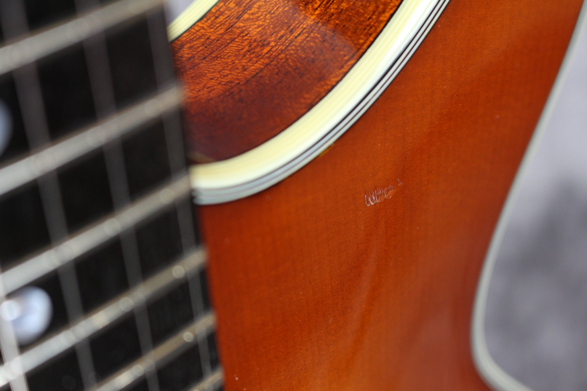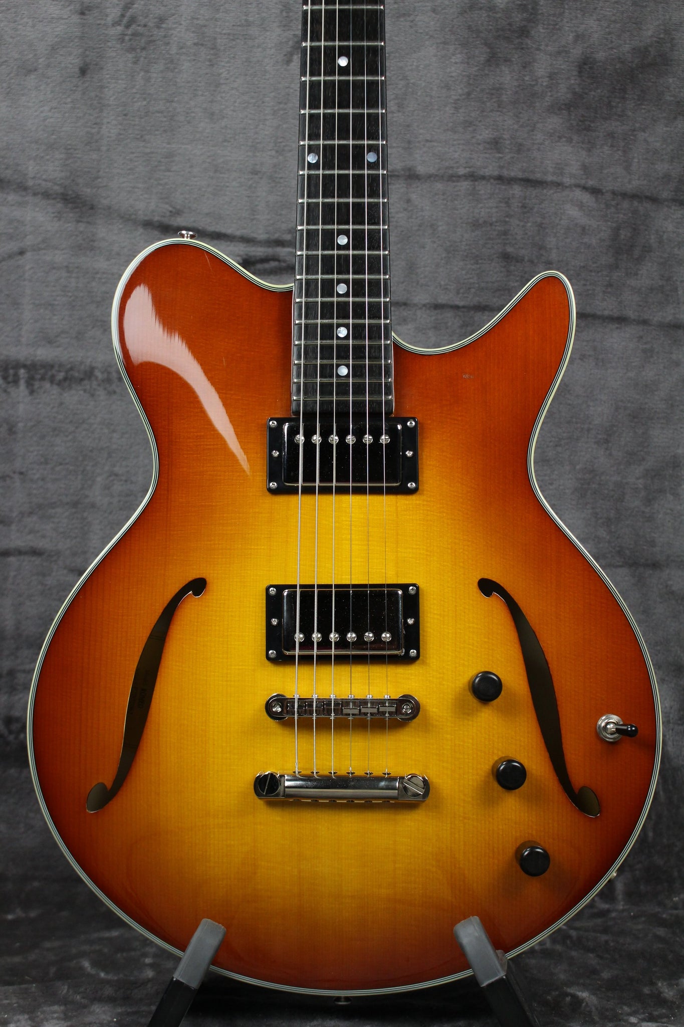 Body: Vintage sunburst, thinline archtop, the top is solid spruce and back and sides are mahogany laminate, gloss finish, cream and black binding on the top/back, dimensions are 14.75” x 1.75”.