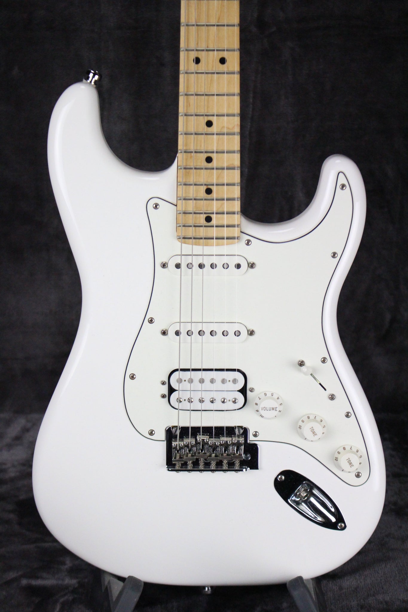 Body: Solid body Stratocaster with an Olympic White finish.