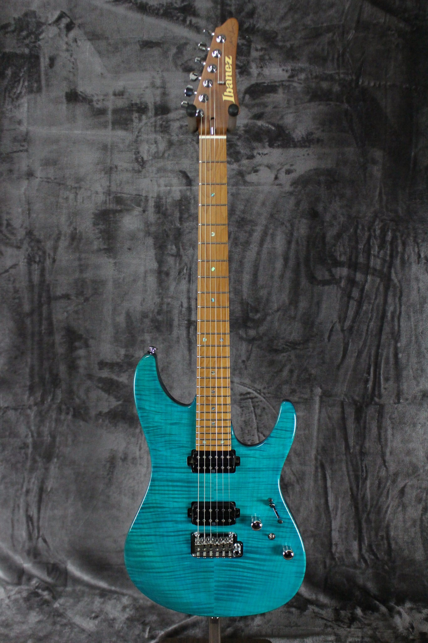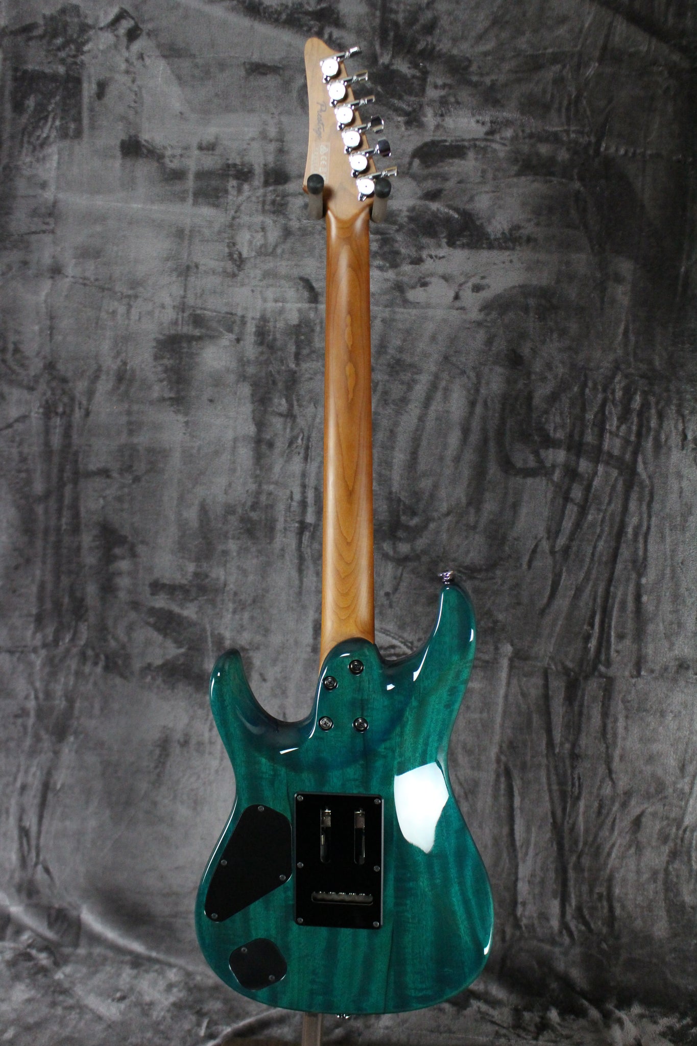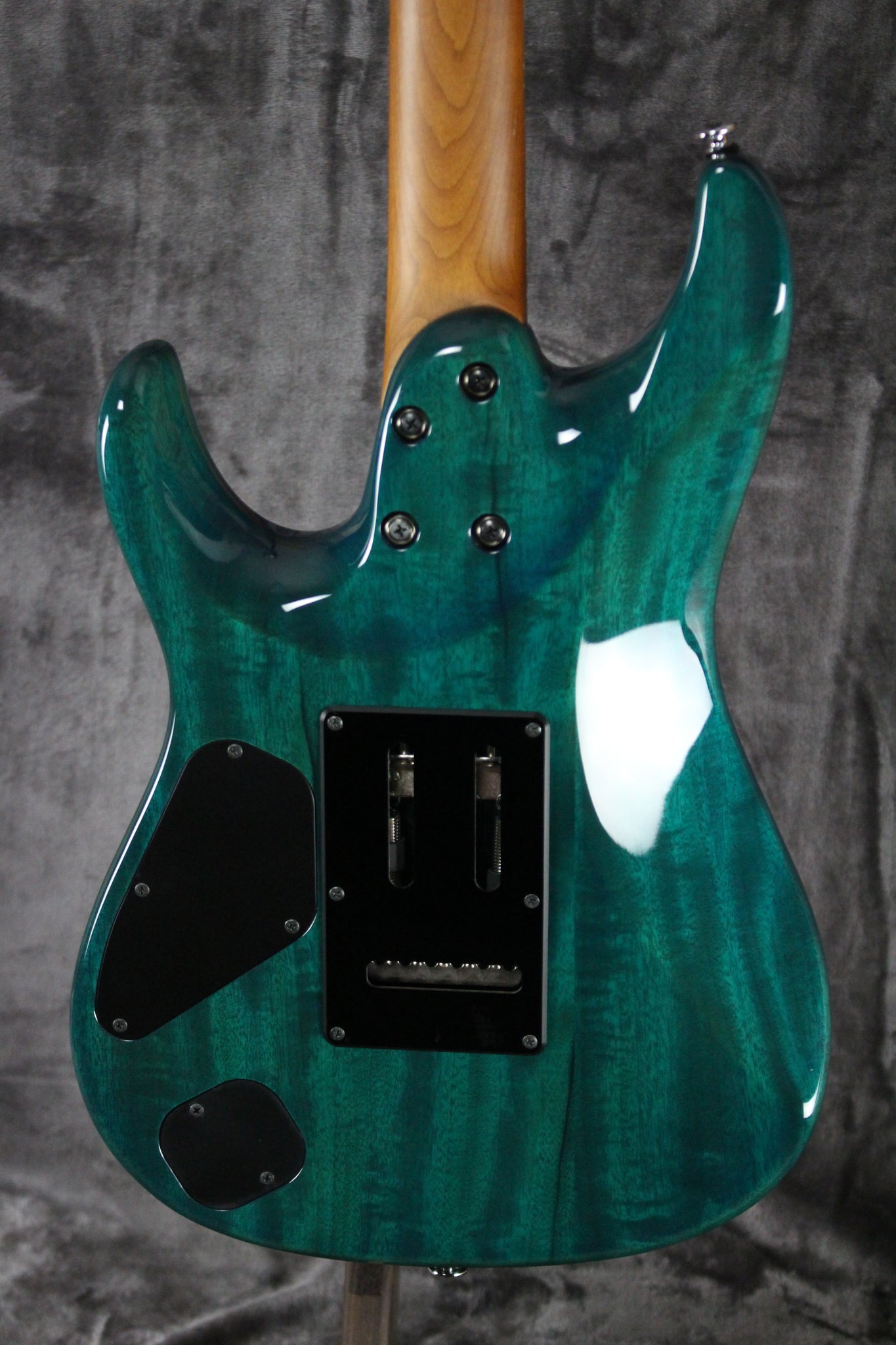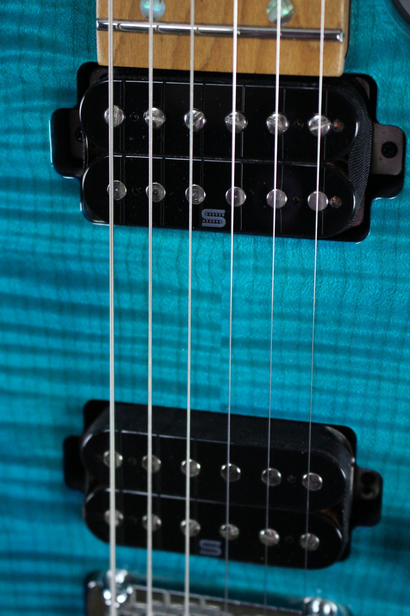 Body: Flamed Maple top, African Mahogany body in Aqua Blue gloss finish.