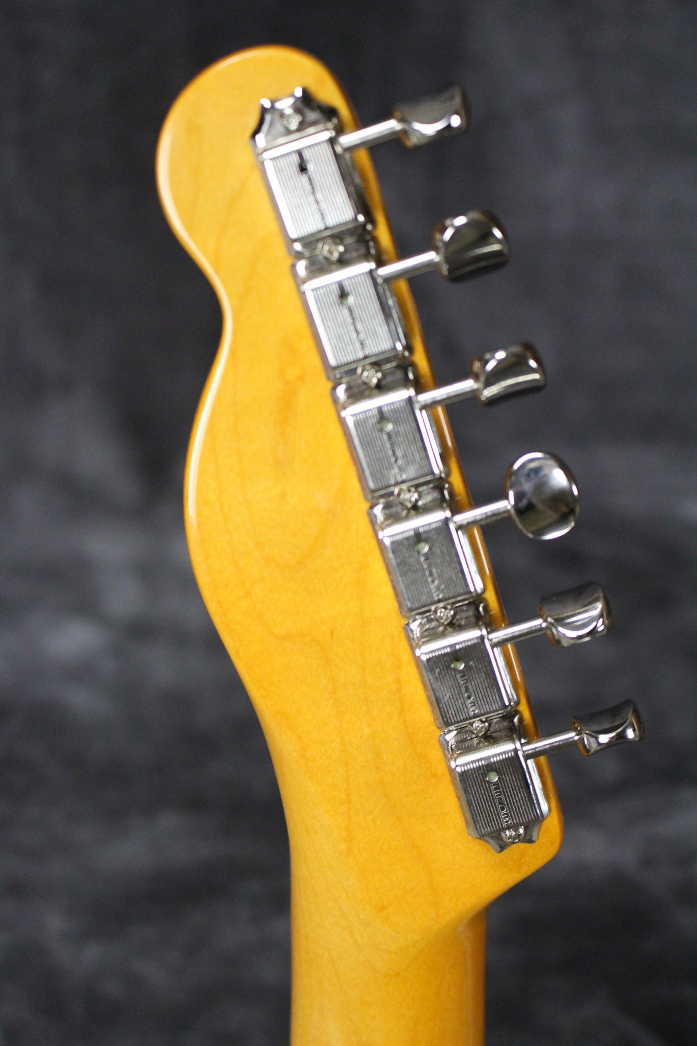 Pure Vintage single line Fender Deluxe tuning keys, Fender Pure Vintage 3-saddle Tele with threaded steel barrel saddles, knurled flat top knobs, bone nut.