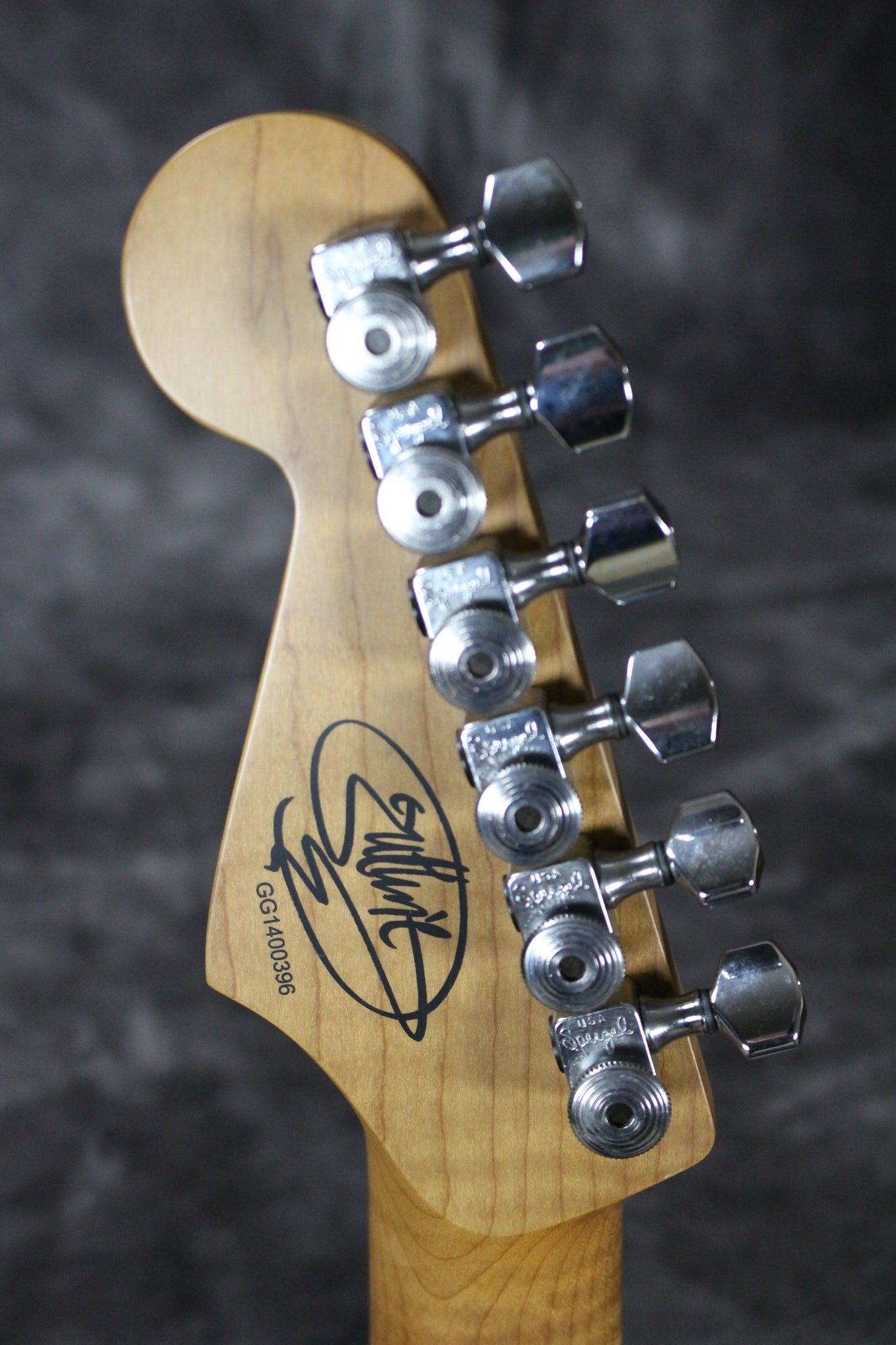 This 2014 Charvel Guthrie Govan Signature HSH features a comfortable, sleekly sculpted San Dimas Style 1 caramelized Basswood body with a stunning flamed Maple top, a blindingly fast bolt-on caramelized flamed Maple Speed Neck with graphite reinforcement, and a 12"–16" compound-radius caramelized flamed Maple fingerboard with rolled edges. Other exceptional features include Luminlay side-dots, Luminlay numbered dome volume and tone control knobs with a brass pin locator, a 2-way toggle switch to engage single-coil simulation.heel-mount truss rod adjustment wheel, Charvel Custom MF pickups, Charvel locking recessed tremolo bridge and Sperzel locking tuning machines.