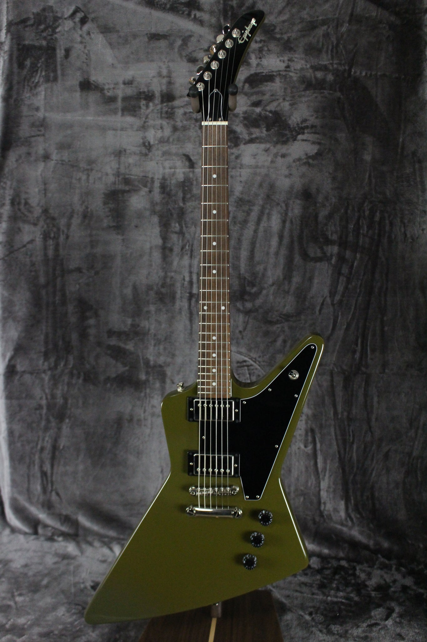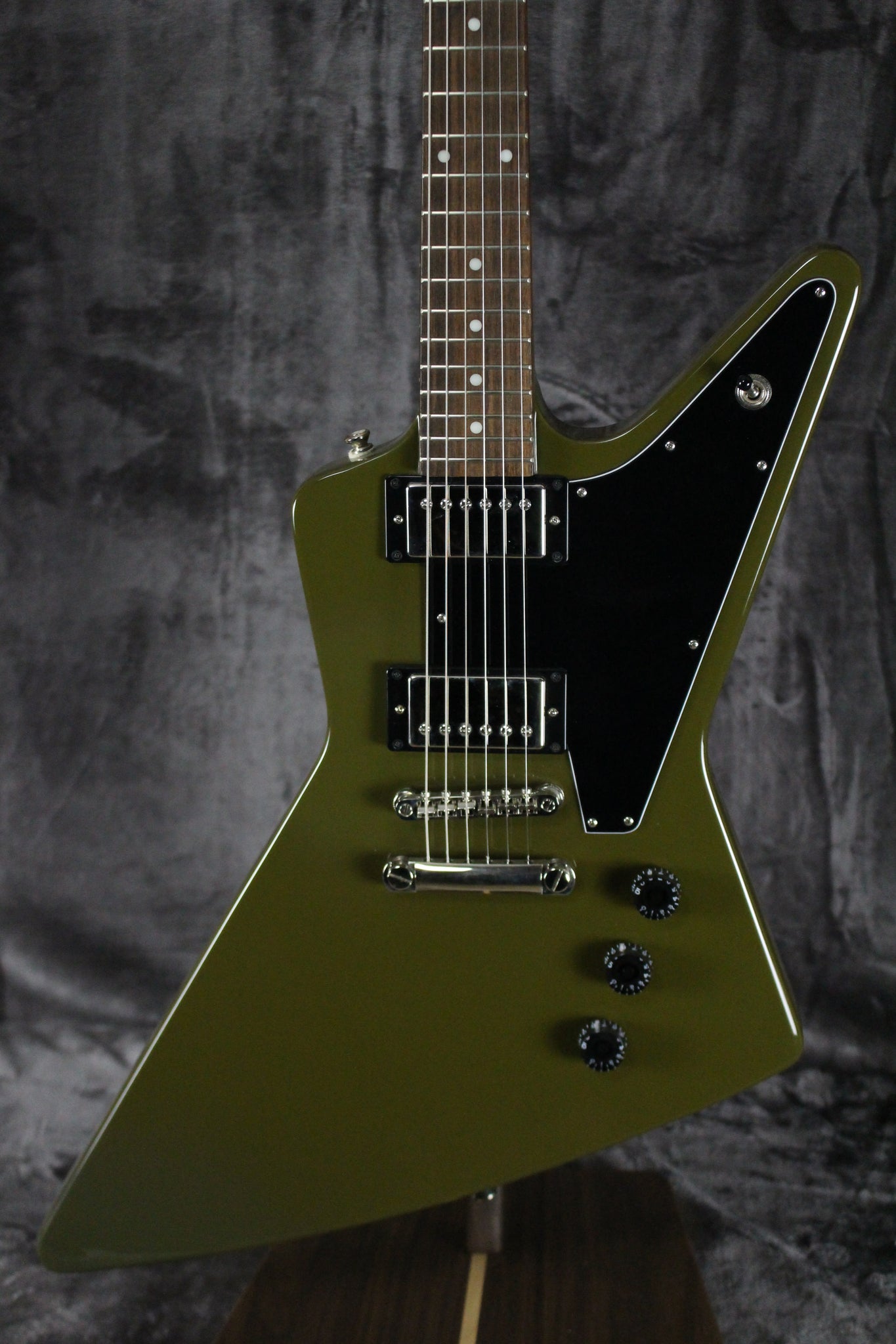 This 2020 Epiphone Explorer Drab Olive Green recreates the ultra-rare classic from 1958. Featuring a Mahogany body in a gloss finish, Epiphone ProBucker humbuckers with CTS electronics, and Grover tuners.