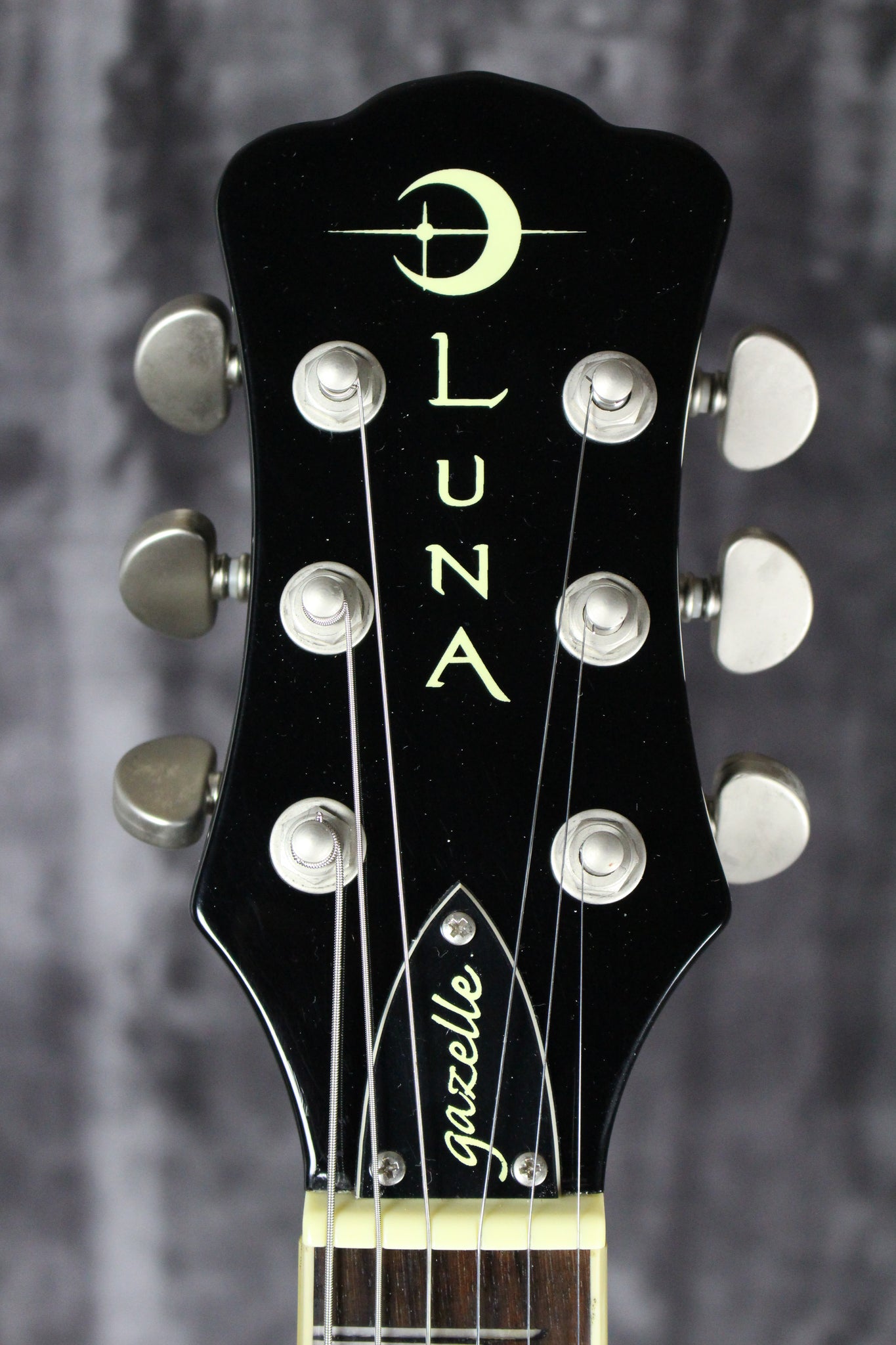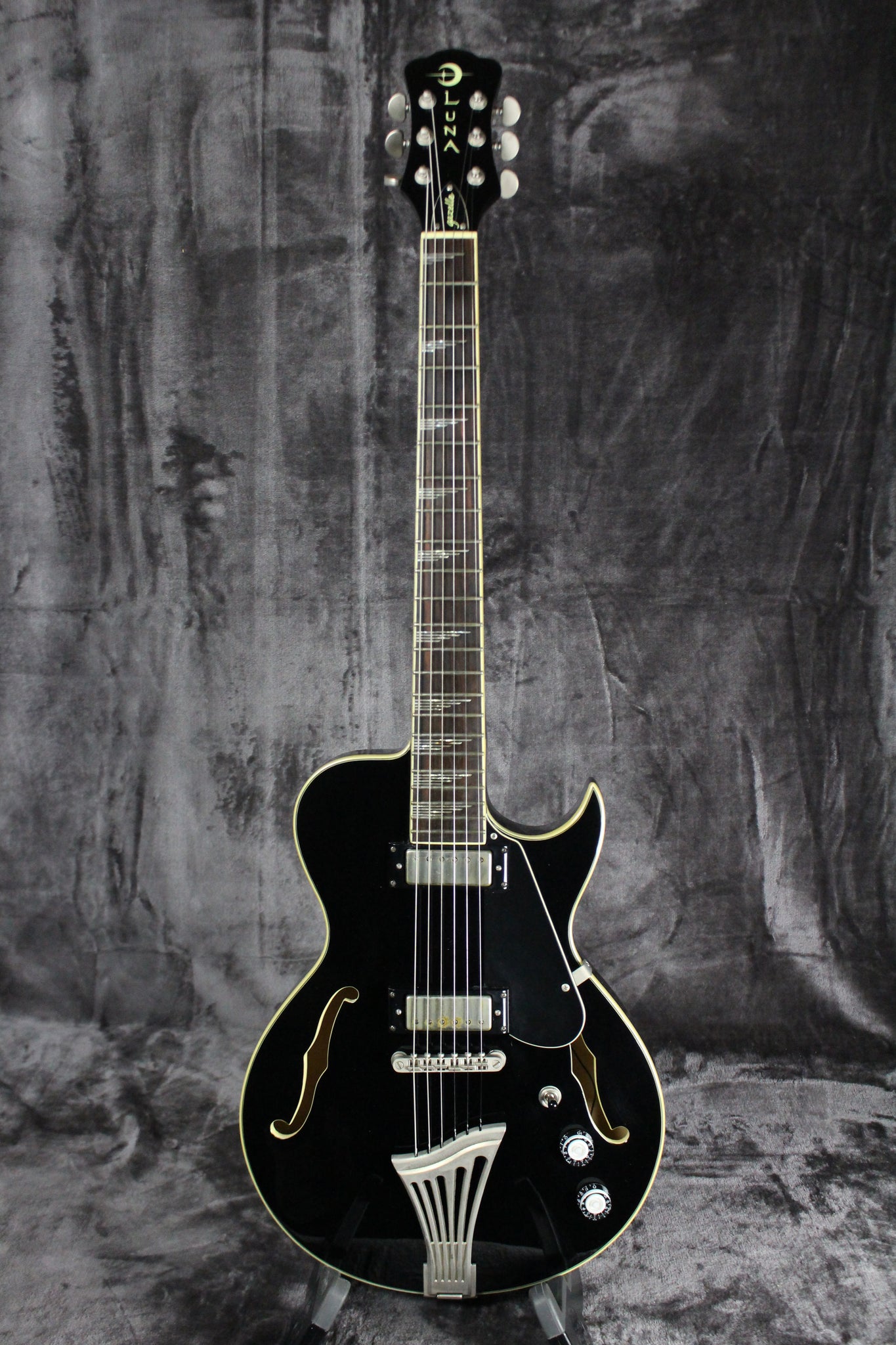 Summary: The stylish hollowbody Luna Gazelle Electric Guitar combines the best elements of vintage jazz-age Art Deco design with totally 21st-century technology and sound, the Gazelle is one fabulous raven beauty. Mini humbucking pickups deliver full-bodied tones and Luna's trademark slim neck profile puts every chord and note within easy reach. The fingerboard inlays feature Art Deco-influenced geometric inlays in a visual crescendo from headstock to body