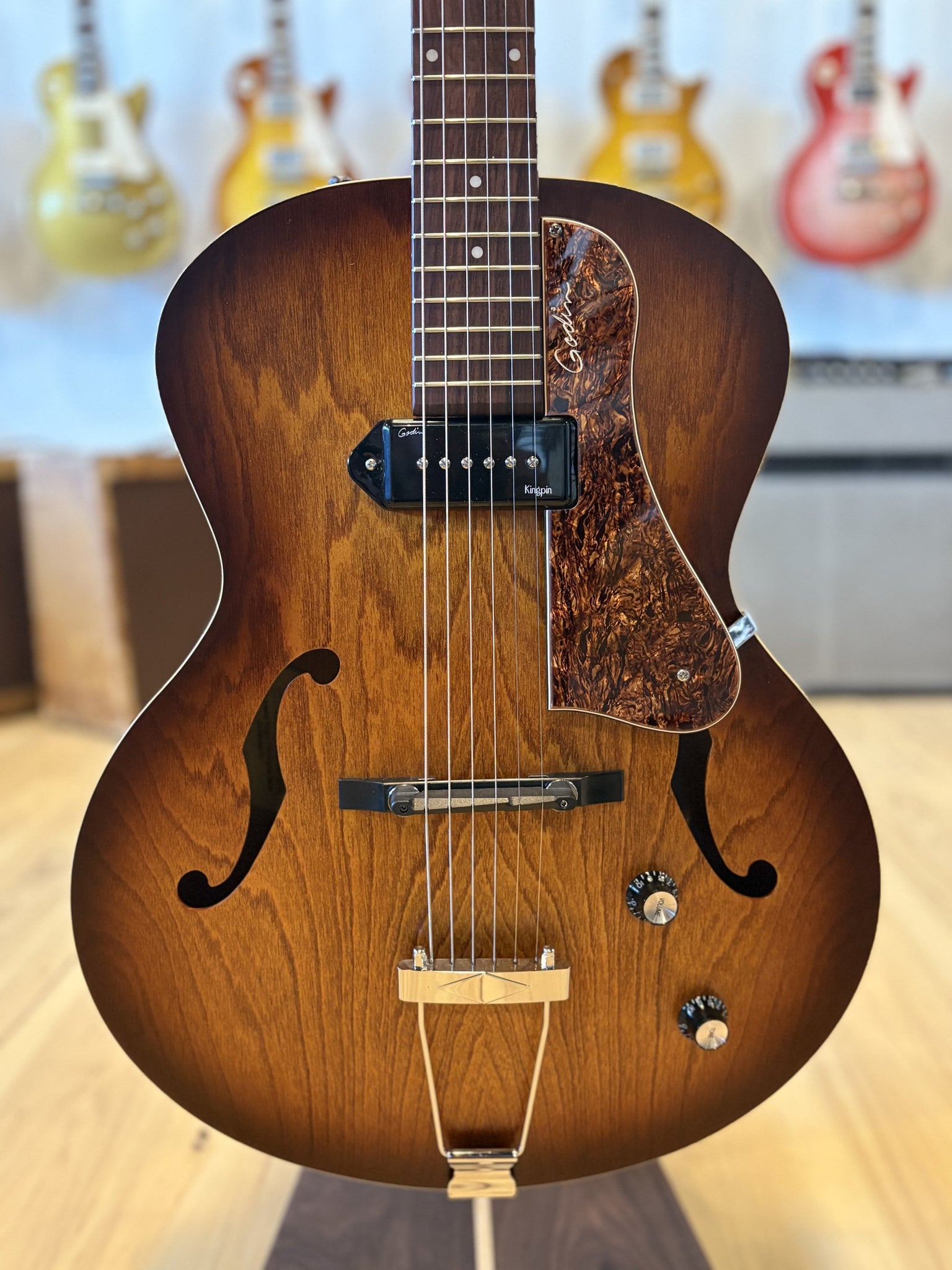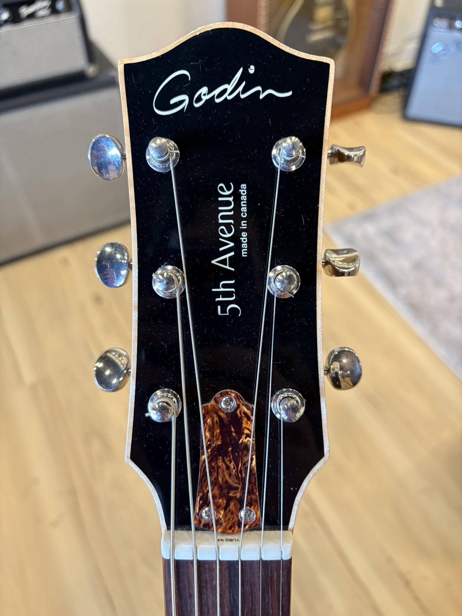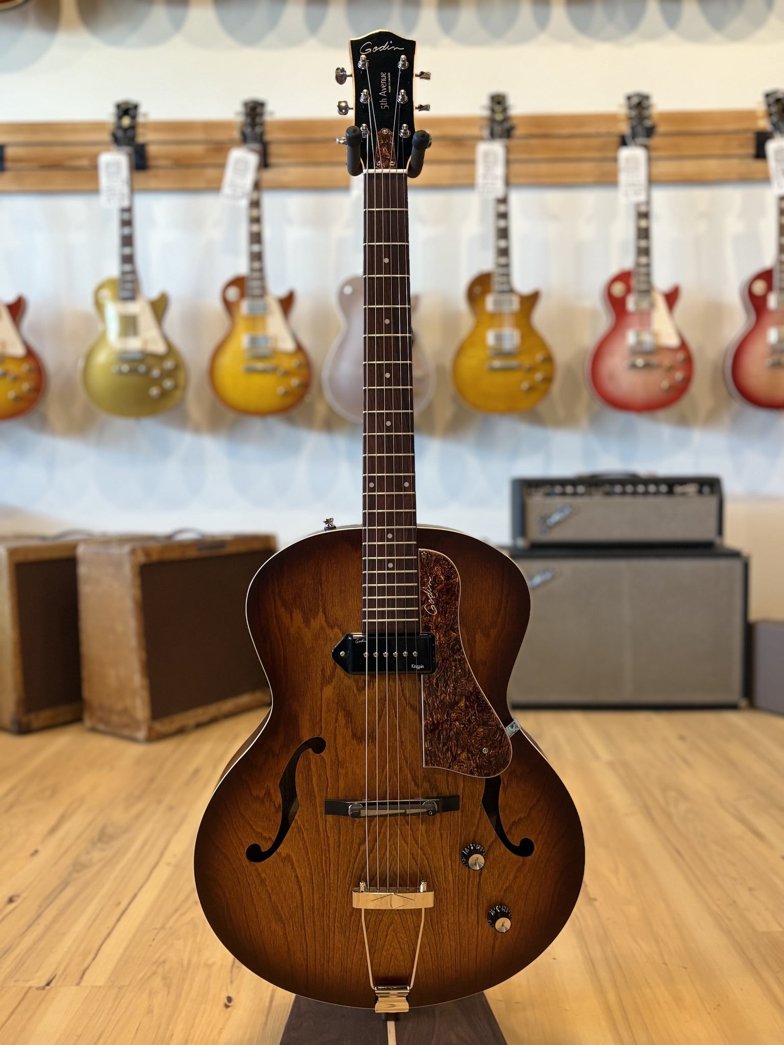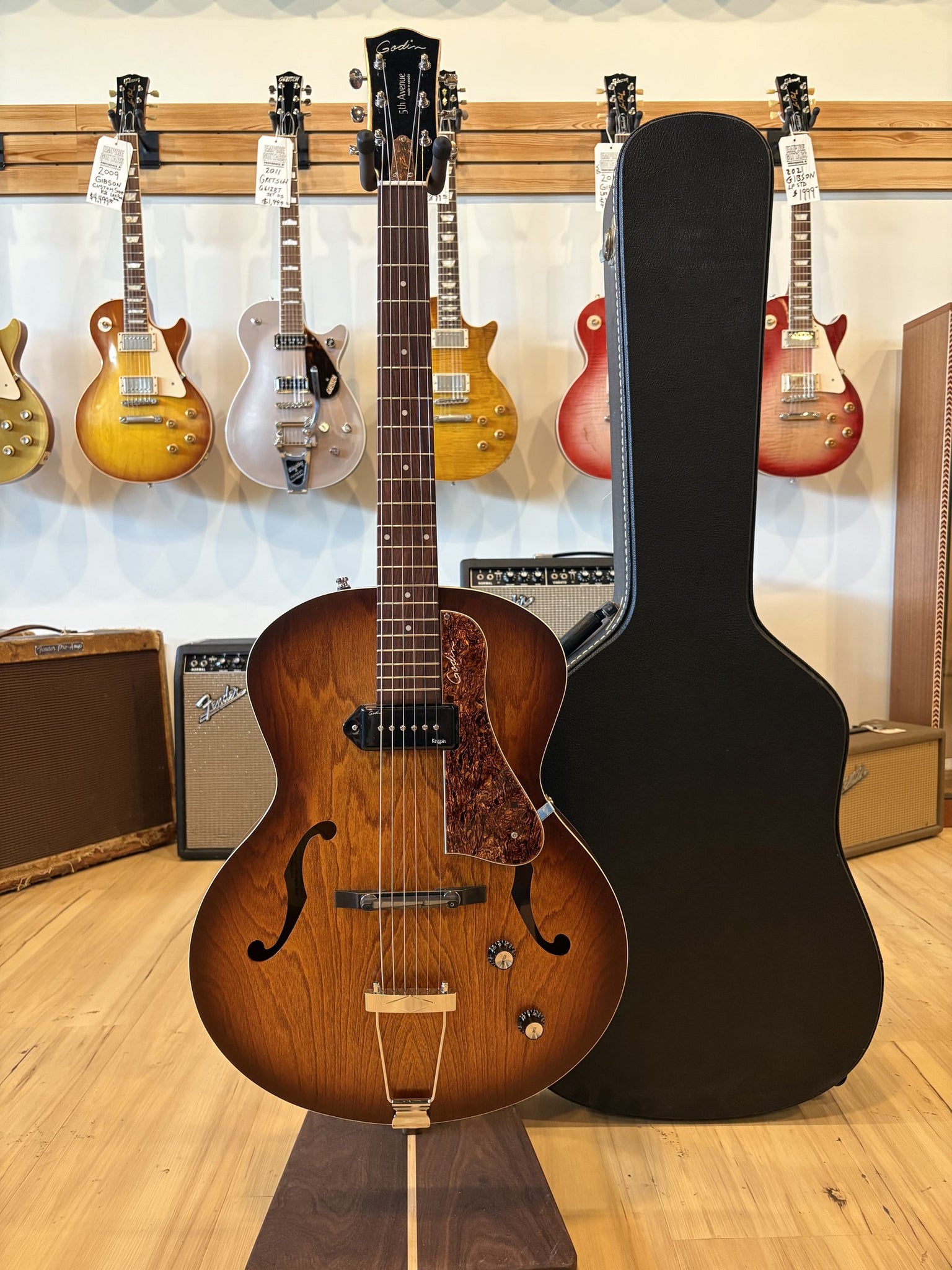 This Godin 5th Avenue Kingpin P90 features a Canadian wild cherry archtop body paired with a silver leaf maple neck and rosewood fingerboard, delivering a balanced acoustic resonance with excellent projection. Its vintage-inspired design is enhanced by a satin Cognac Burst finish, evoking classic jazzbox aesthetics with modern playability. The single Godin Kingpin P90 pickup offers warm, gritty tones with a raw edge, perfect for blues, jazz, and rockabilly styles. With its smooth cutaway for improved upper-fret access, distinctive f-holes, and high-quality craftsmanship, this model blends old-school charm with contemporary versatility.