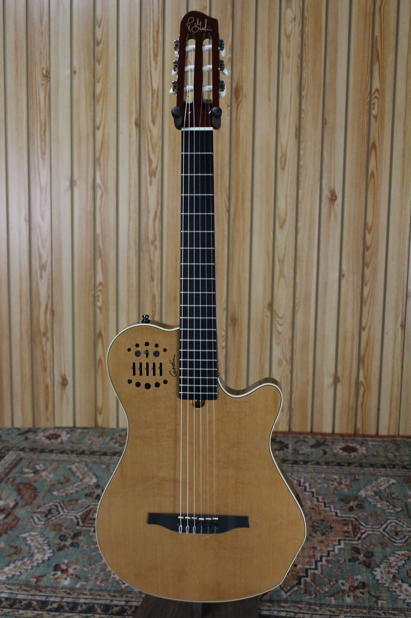 This 2018 Godin Multiac Grand Concert SA acoustic-electric guitar is an instrument that defies simple definition, with its chambered mahogany body and solid cedar top, it offers the playability of a solid body electric, the organic warmth of a traditional nylon. The flexibility of the onboard RMC Polydrive electronics, coupled with the Synth Access hexaphonic pickup output, let’s you take full advantage of today's hottest guitar processors.