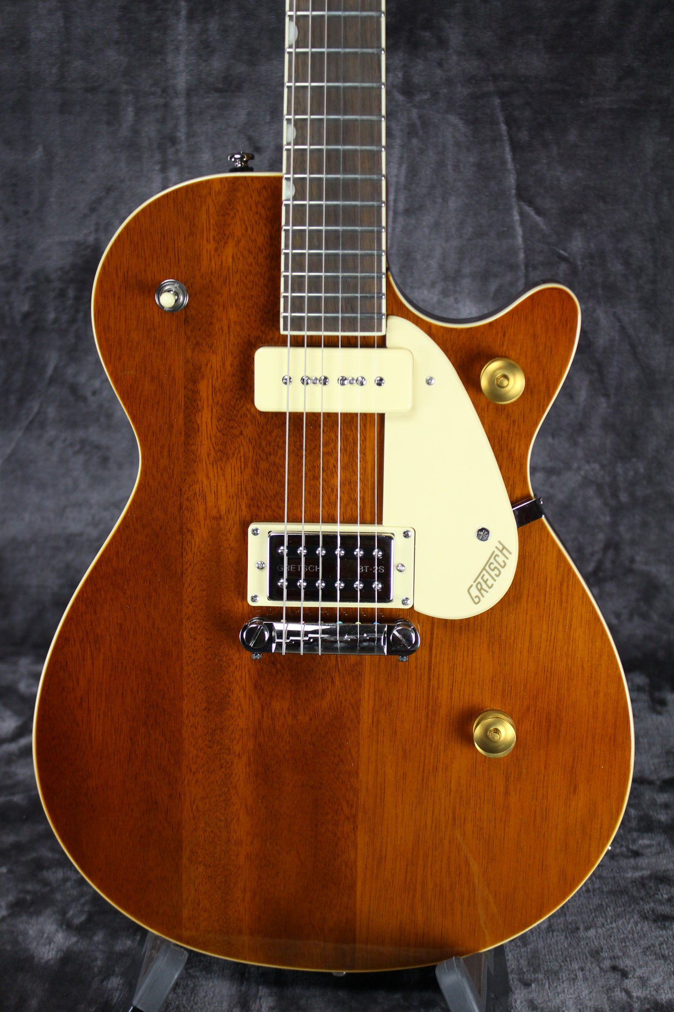 Pickups/Hardware: Gretsch Broad'Tron BT-2S bridge,P90 Soap Bar neck pickups, die-cast tuning keys, anchored compensated wrap-around bridge, Gold Electro-Style knobs, Synthetic Bone nut.