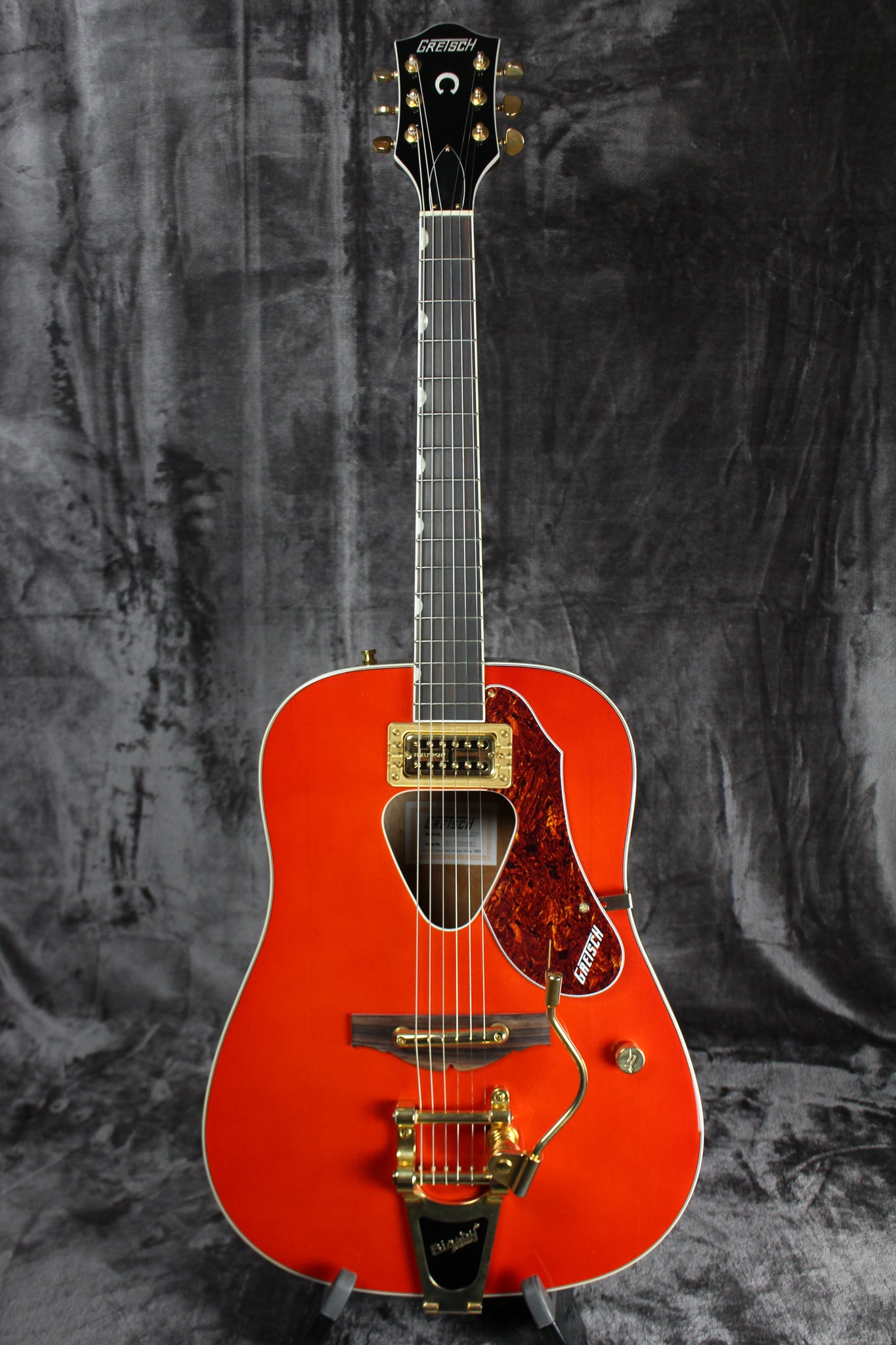 Pickups/Hardware: Traditional Gretsch Rancher "Triangular" Sound Hole, Iso-Chamber Mounted Fideli'Tron Pickup, White Bound Neck and Headstock, White Bound Body with Black/White/Black/White Top Purfling, White Heel Cap, Black Painted Headstock with White Pearloid Gretsch Logo and Horseshoe, Synthetic Bone Nut, Knurled Strap Retainer Knobs, Adjustable Truss Rod with Headstock Adjustment, Tortoiseshell Pickguard, Bigsby Licensed B70 Vibrato, Rocking Bar bridge.