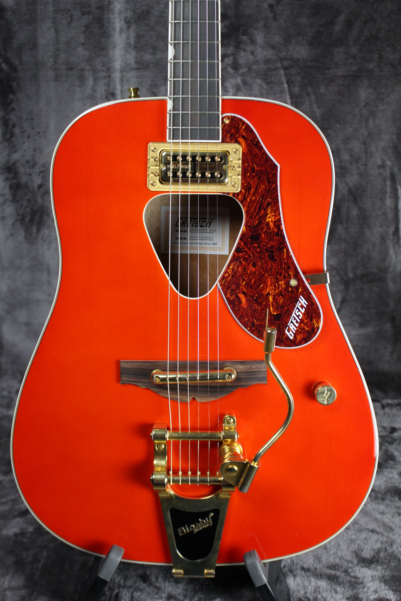 Summary: This 2017 G5034TFT Rancher dreadnought is one of the most distinctive Rancher models ever, with an iso-chamber mounted Fideli'Tron pickup for great amplified tone and performance and a Bigsby B70G tailpiece with a "wire" trem arm. With a laminated spruce top, arched laminated mahogany back, laminated mahogany sides, classic Rancher bound triangular sound hole, mahogany neck, 16-fret laurel fingerboard with Neo-Classic thumbnail inlays, volume control, rocking bar bridge with laurel base, deluxe tuners and gold-plated hardware this guitar is ready for a stroll on Honky Tonk Highway or Bleeker Street.