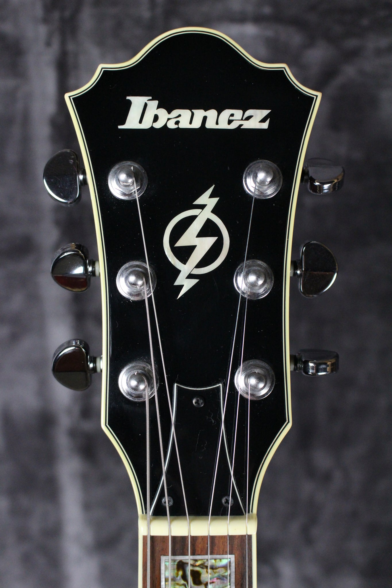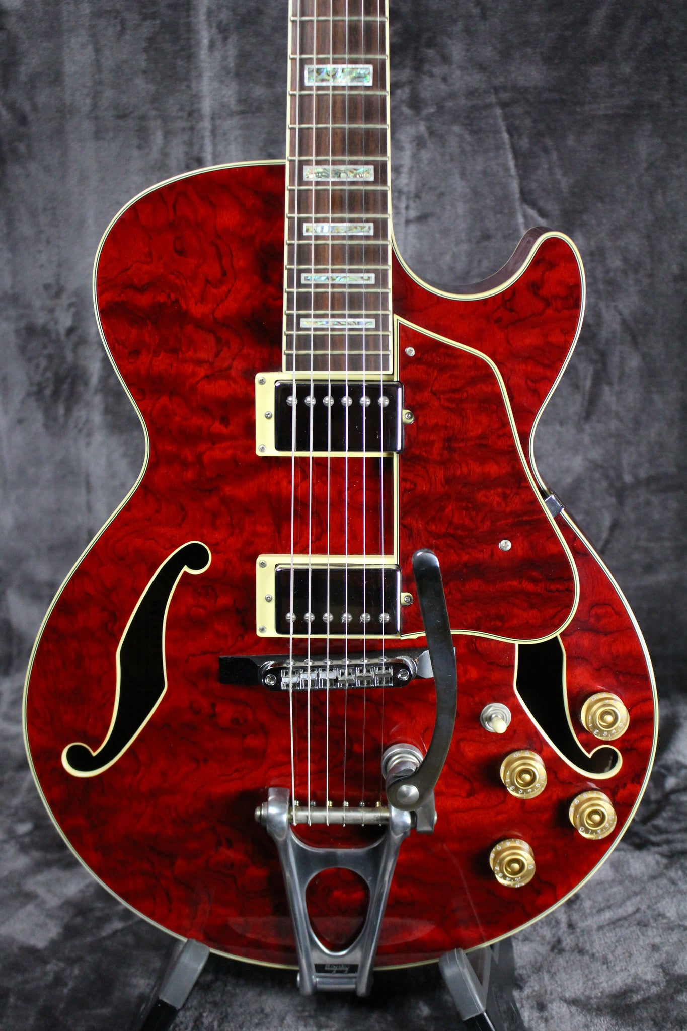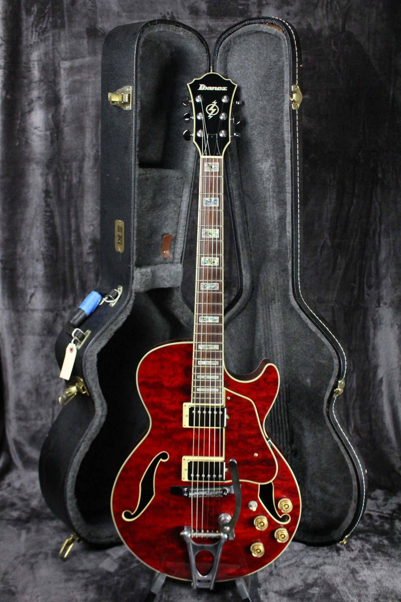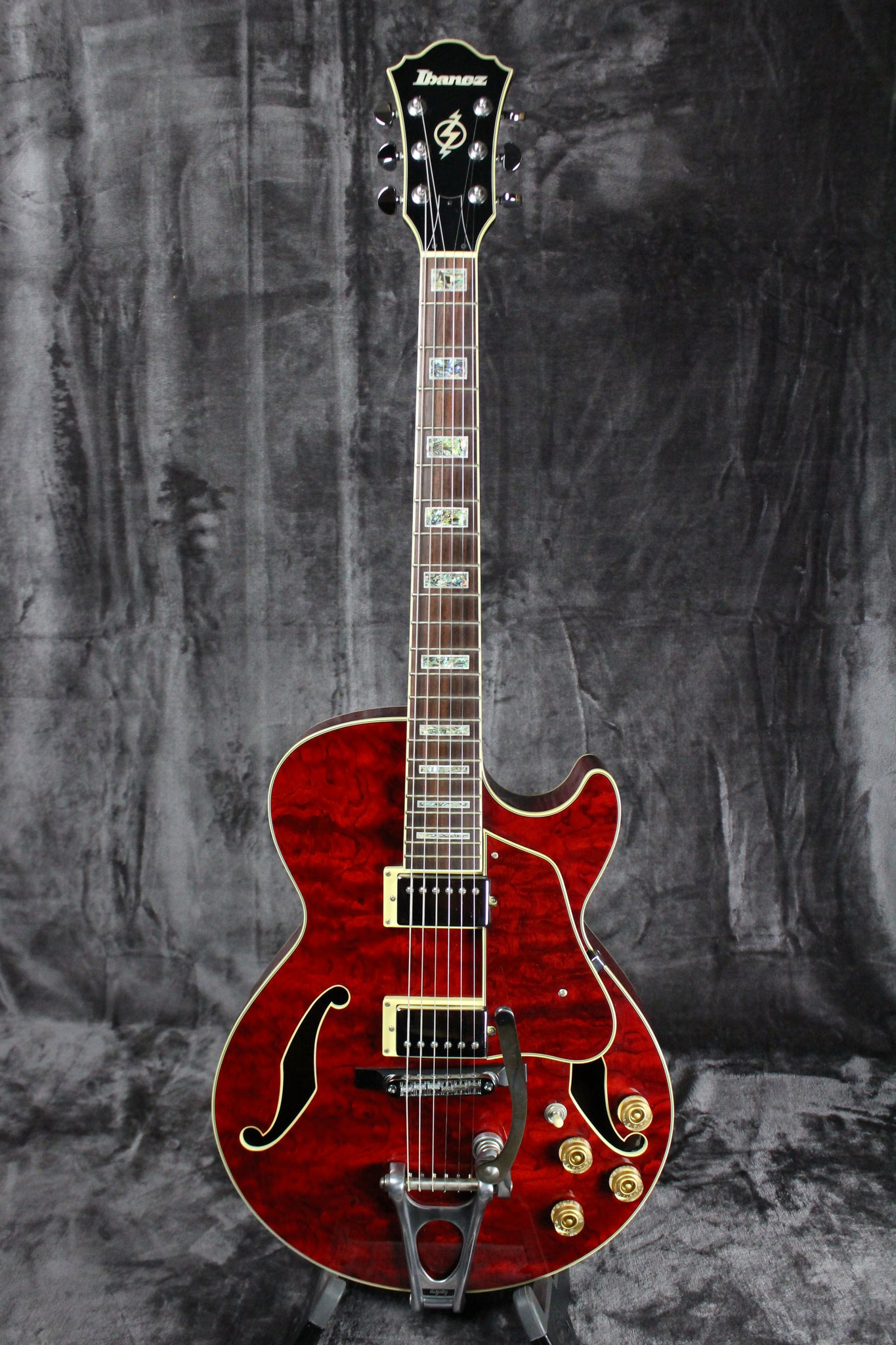 Pickups/Hardware: Ibanez Artrcore Humbucker pickups, Ibanez die-cast tuning keys w/ half-moon buttons, Bigsby style tailpiece with ART-1 on a wooden base bridge, gold speed knobs, ivory plastic nut.