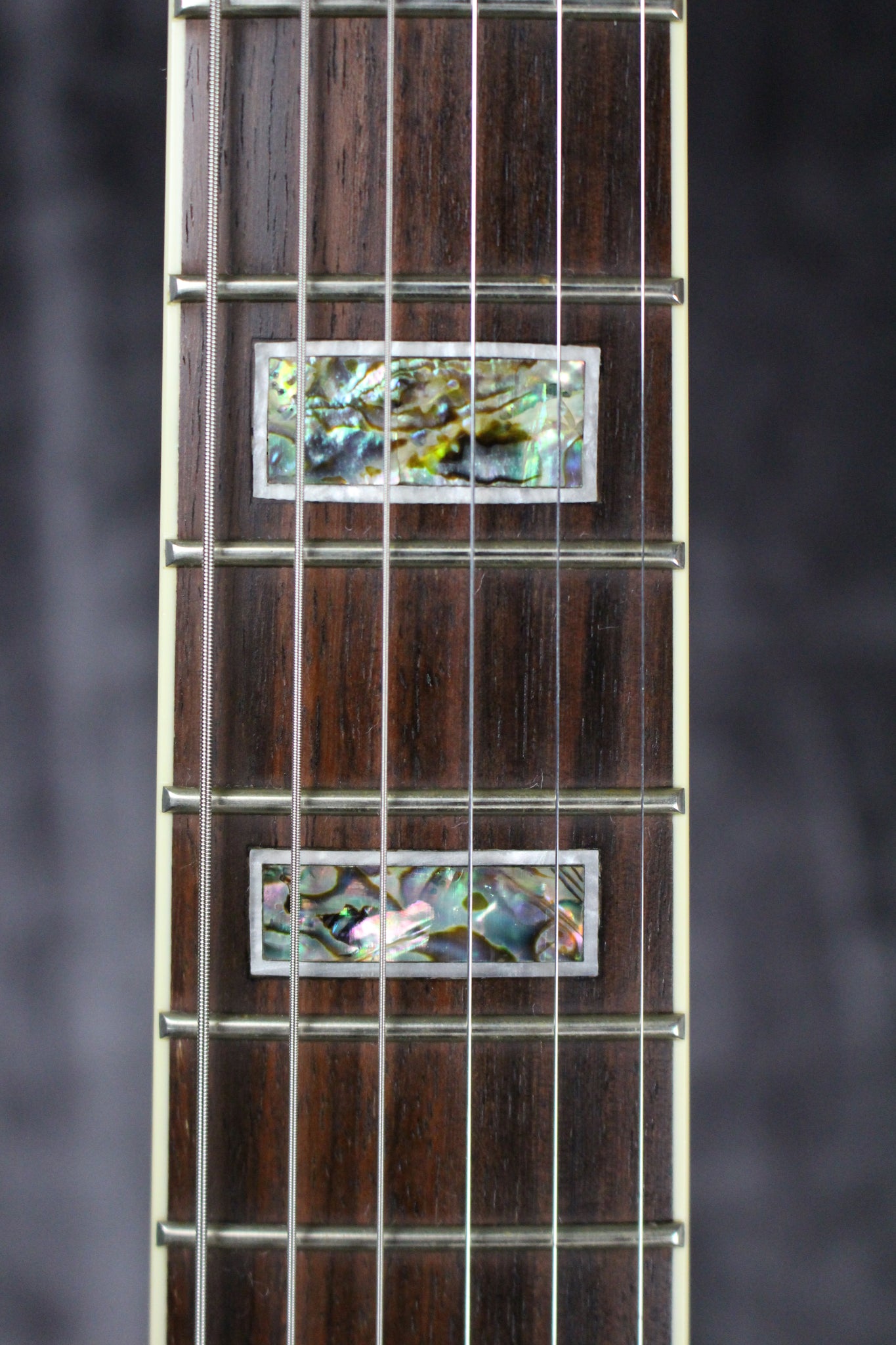 Neck: Maple/Mahogany with a bound Rosewood fingerboard, 24.75” scale length, 1.69” nut width, 22 frets, Abalone Artcore DX block inlays.