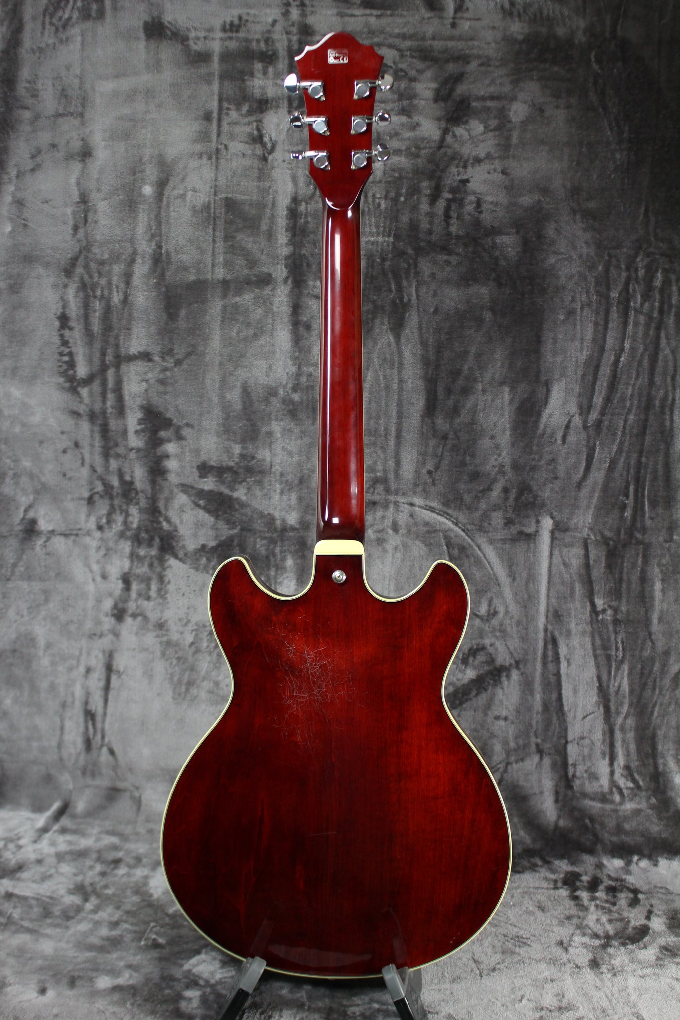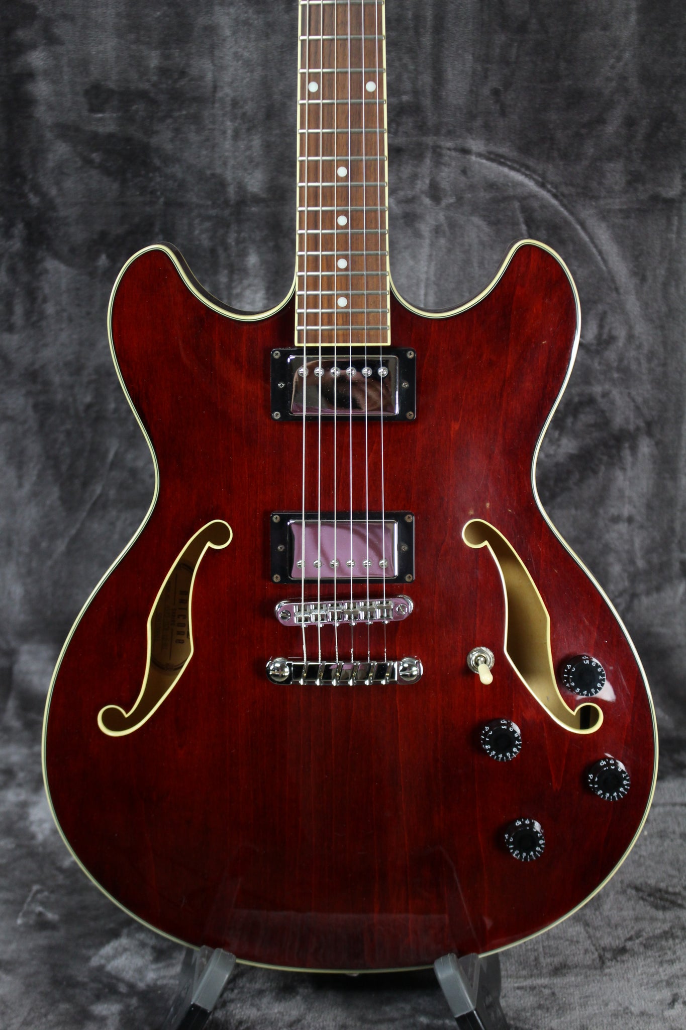 Body: Semi-hollow body all-laminate linden body with 2 fully bound f-holes….the Top and back have beautiful cream binding and a cool Transparent Crimson Red finish.