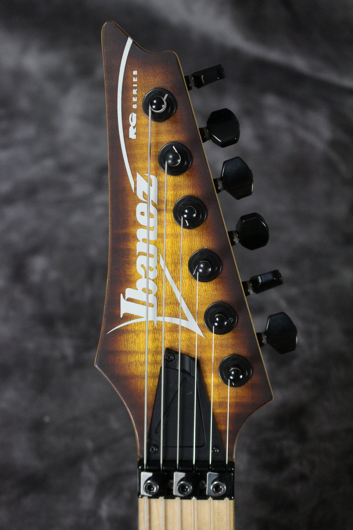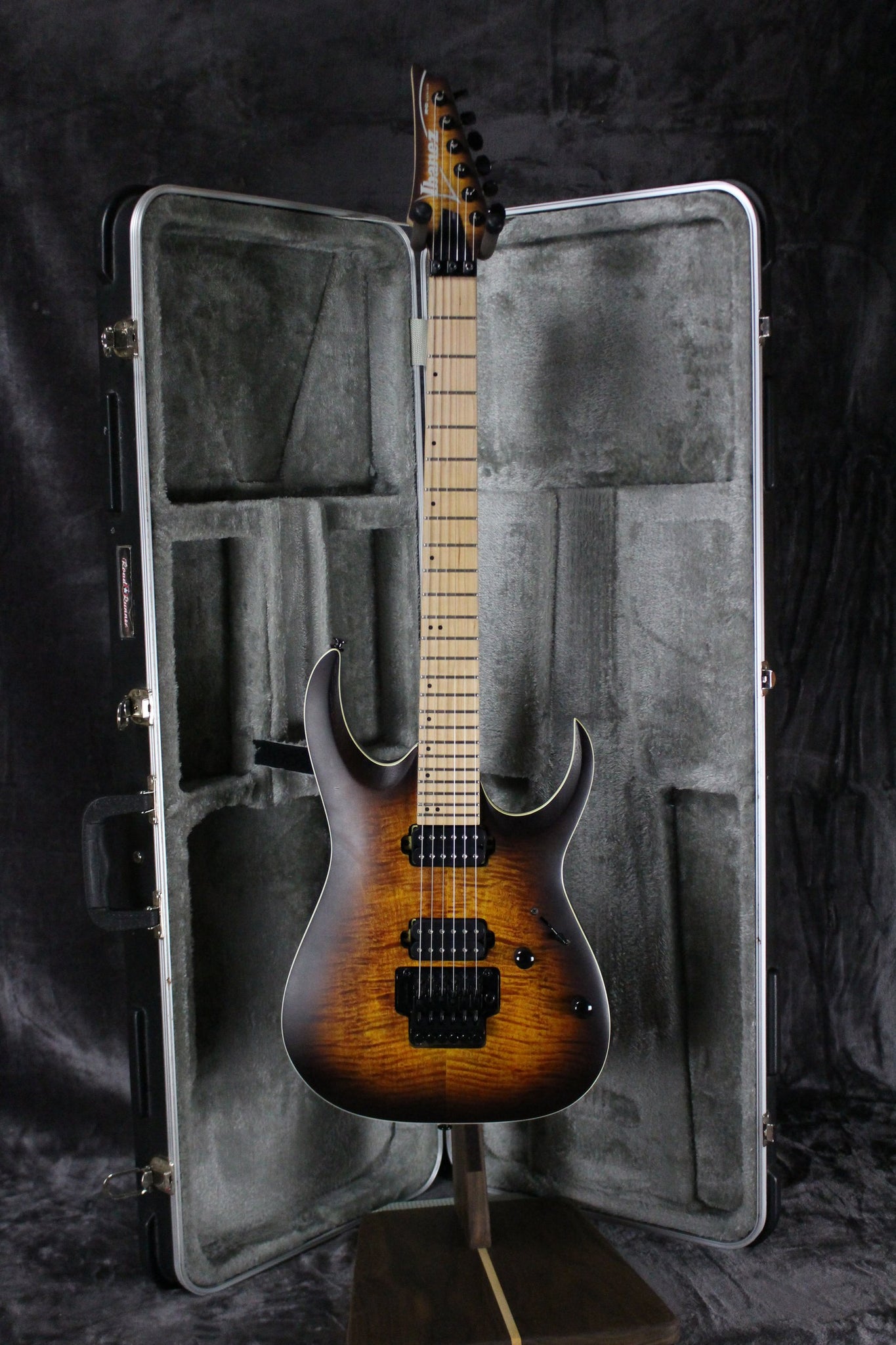 This Ibanez RGAR42MFMT features a Mahogany body with an arched flamed Maple top bolted to a Maple neck with a reversed headstock and a 24-fret Maple fingerboard with offset dot position markers. Choice components include dual, passive Ibanez Quantum humbucking pickups and a double locking tremolo bridge.