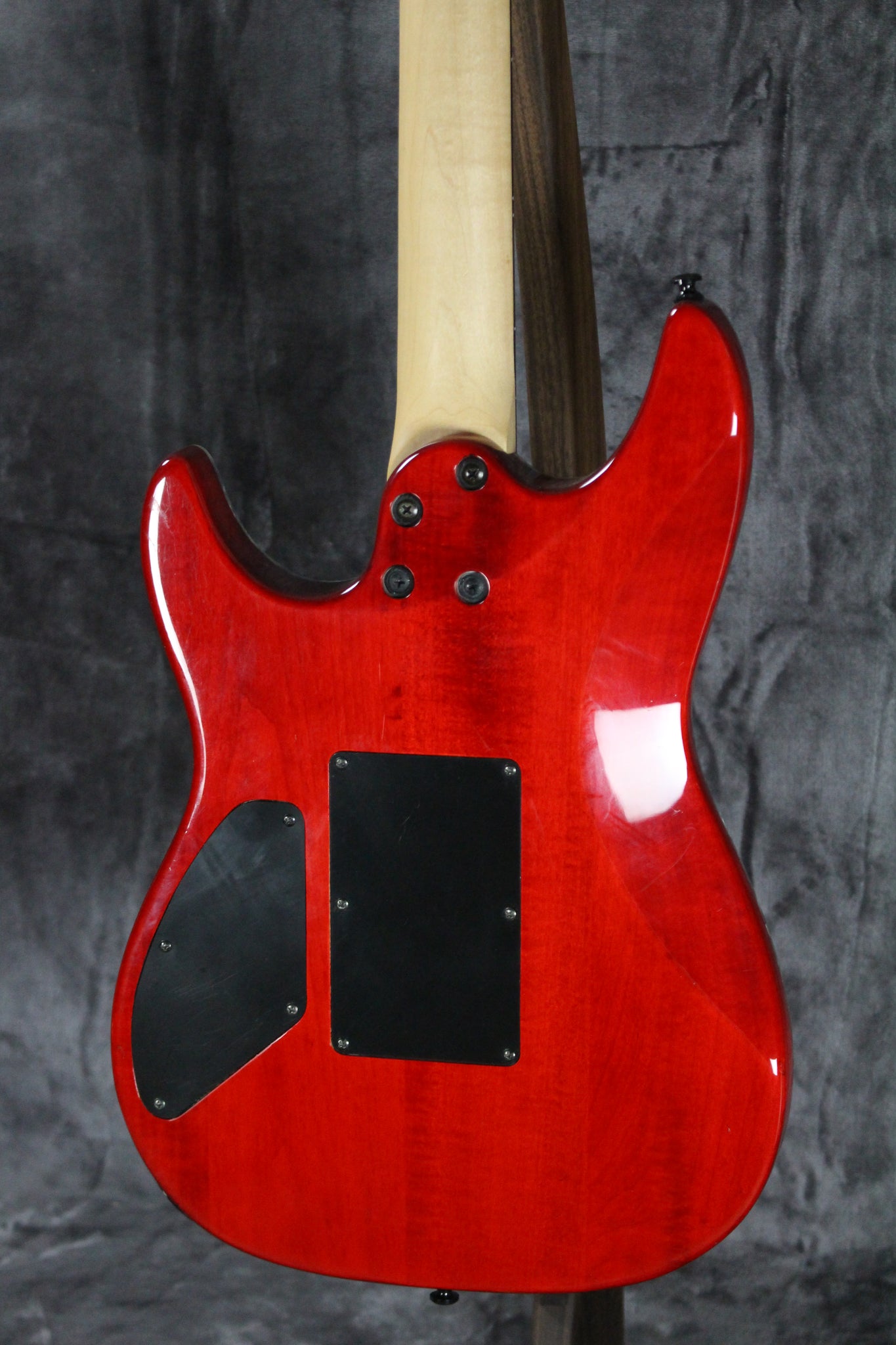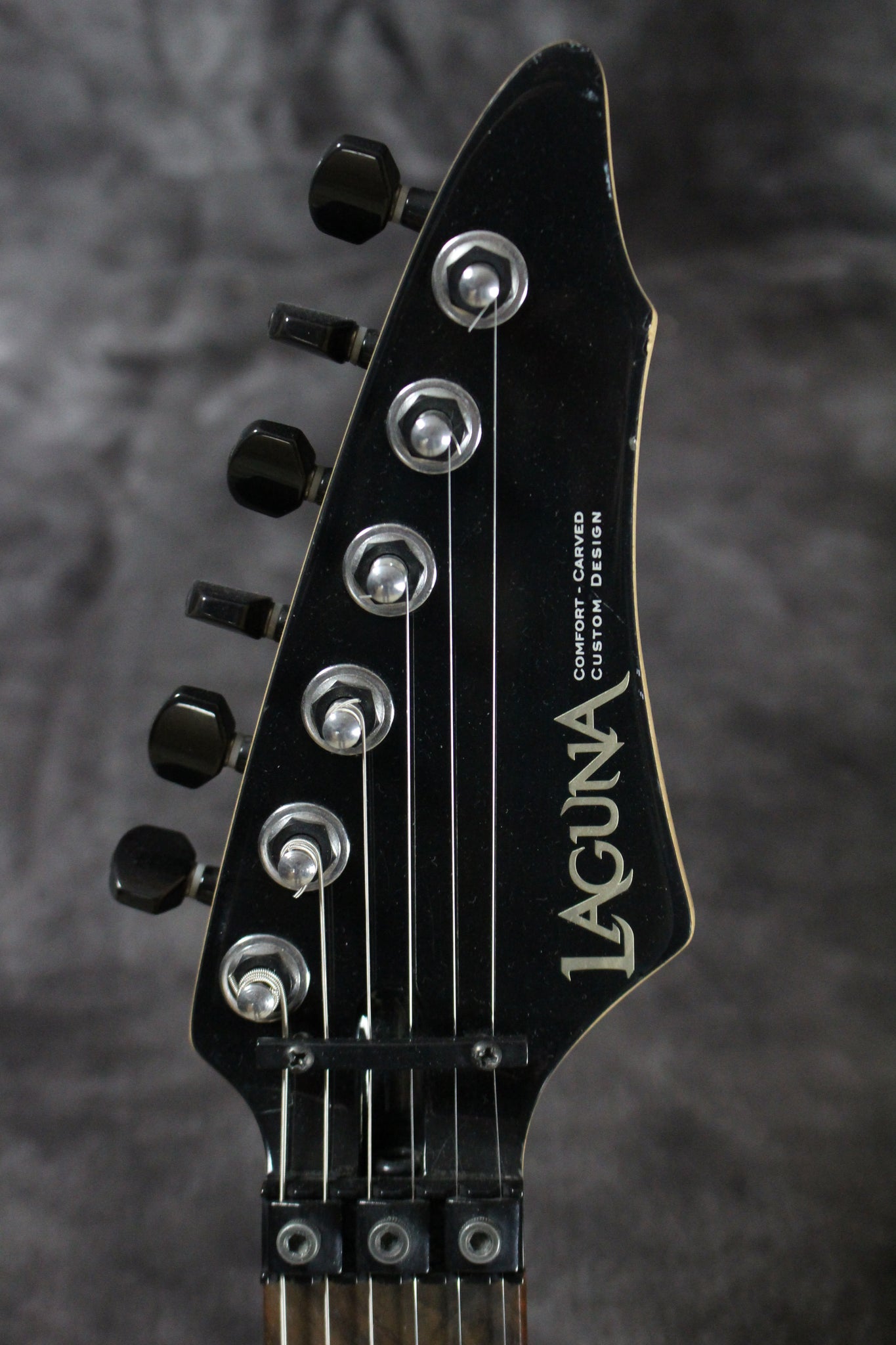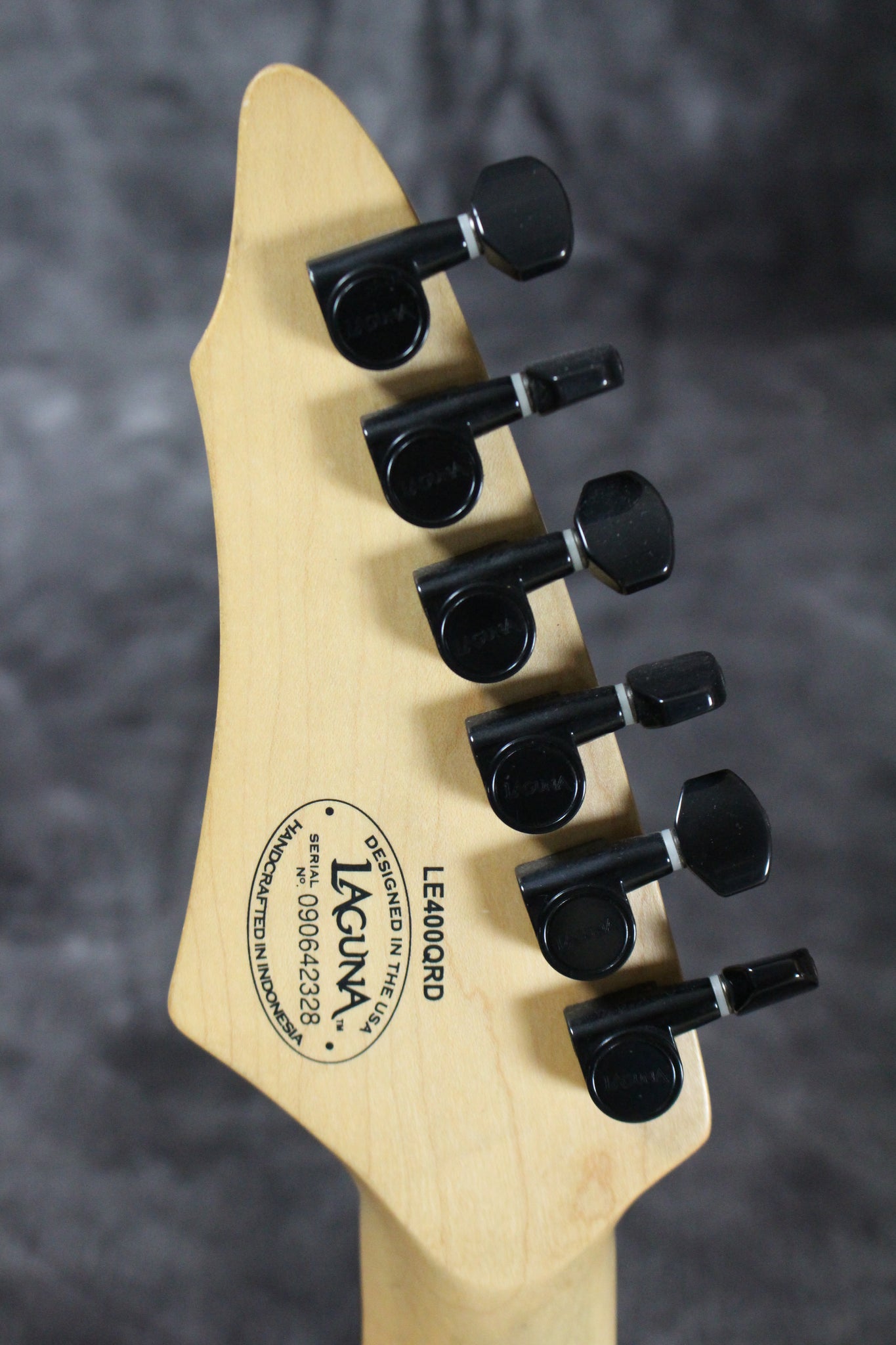 This Laguna electric guitar is in great shape and is set up very well. The FR style tremolo system allows for all the dive bombing and bending you can handle. The knobs have been replaced with chrome skull knobs and the top of the body has a beautiful red quilt. It has two custom alnico humbuckers with a ton of output.