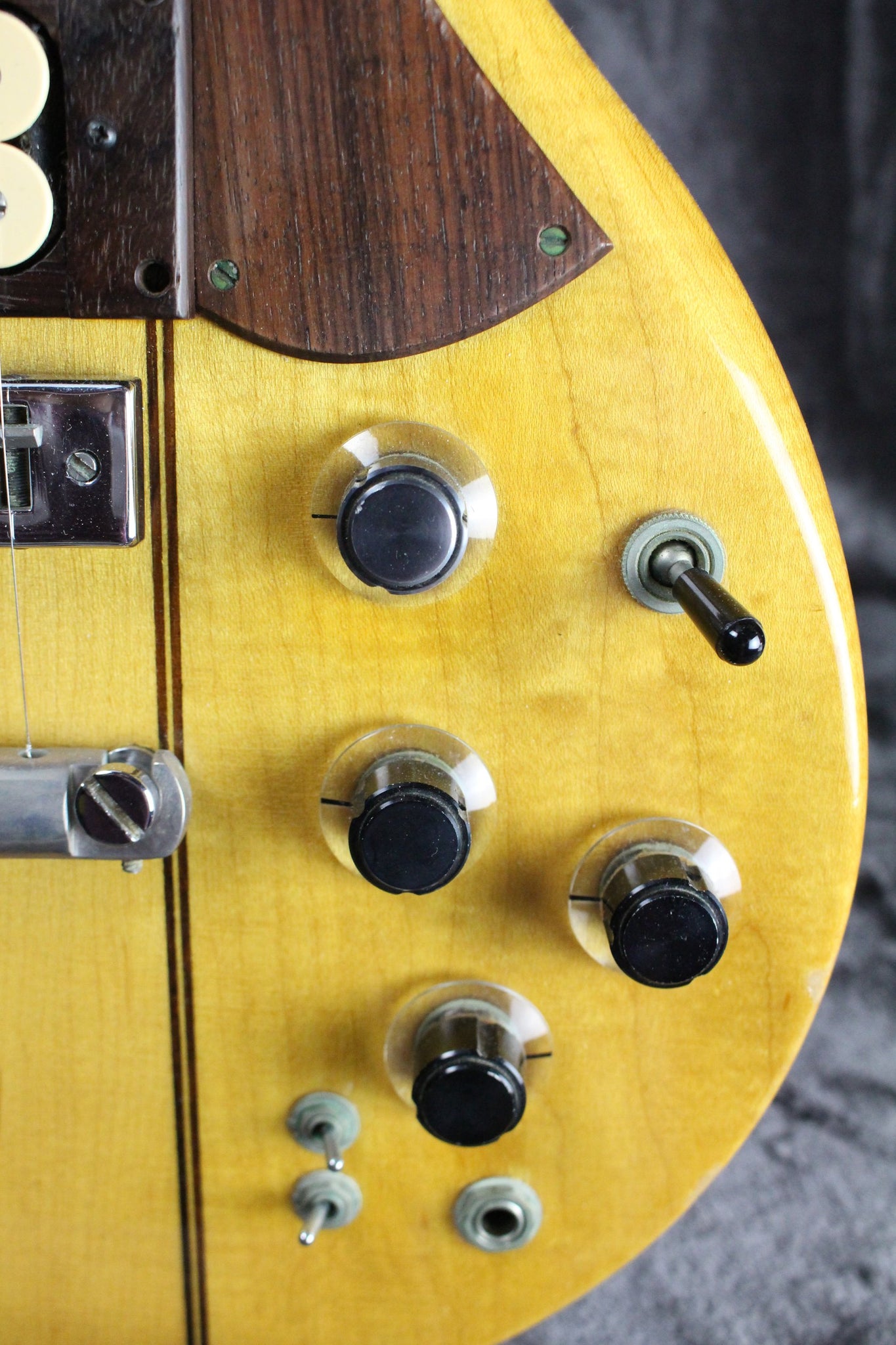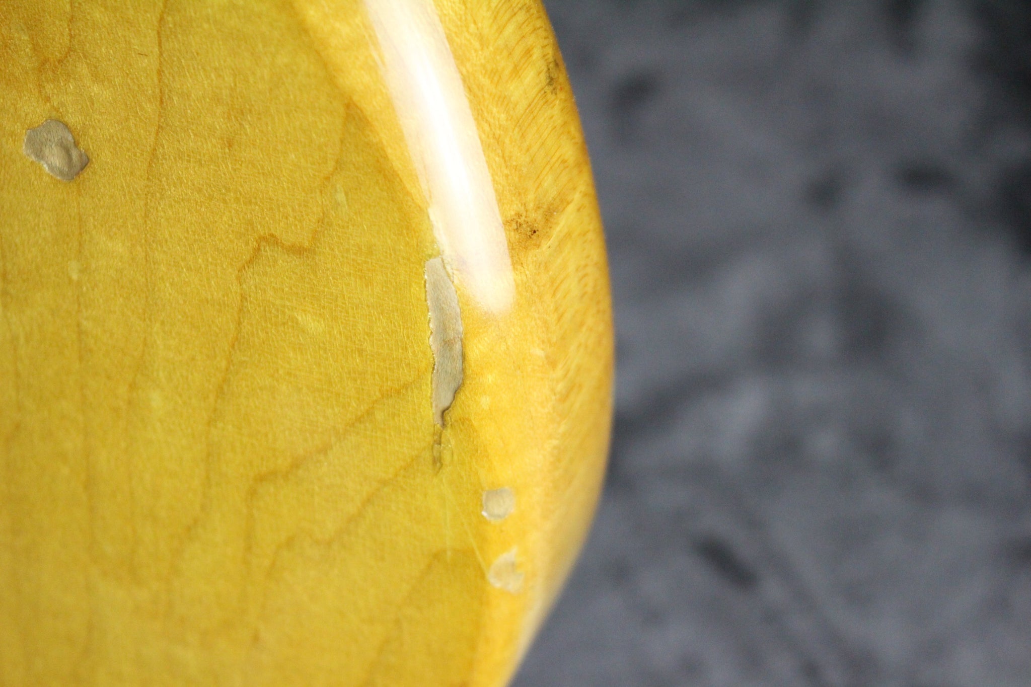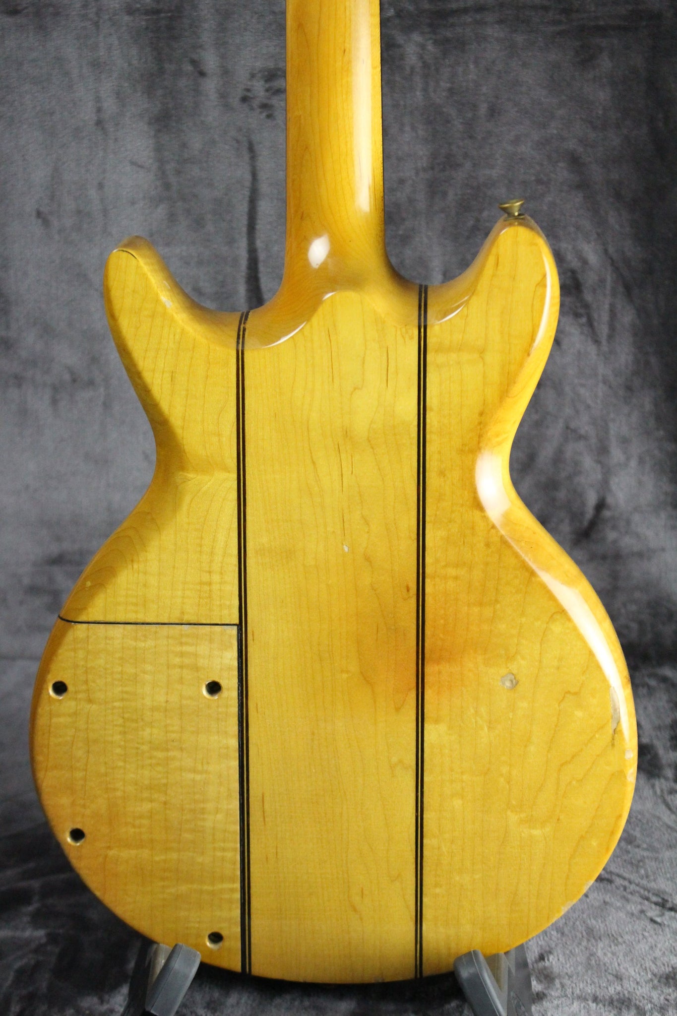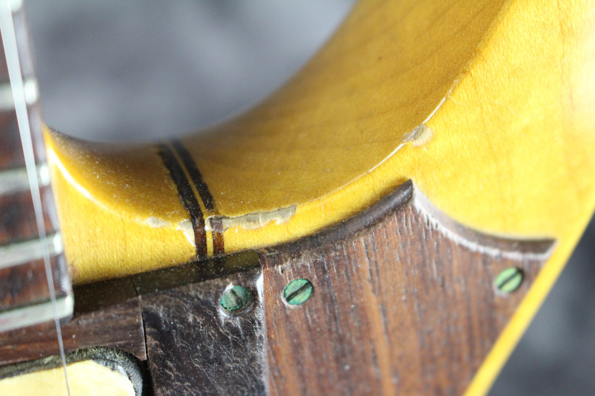 Body: Double cutaway solid maple 3-piece body with rosewood/maple/rosewood stringers. Finished in nitrocellulose lacquer which has aged nicely into a rich amber/yellow color with lots of weather checking.