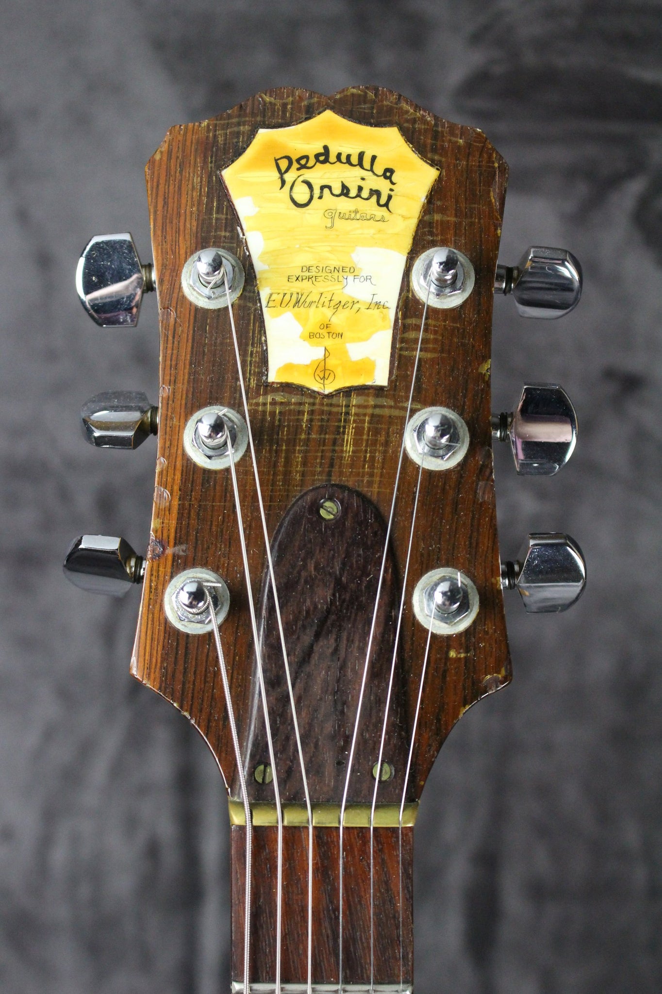 Neck: Maple neck with a rosewood fingerboard, pearloid block inlays, 24 frets, 25.5” scale length, 1 9/16” nut width. The headstock has a rosewood overlay with very cool hand etched inlay which reads “Pedulla Orsini guitars Designed Expressly for E.D. Wurlitzer, Inc of Boston”