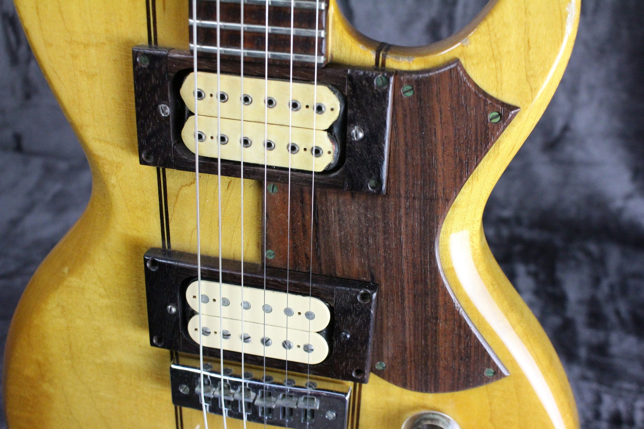 Cosmetics: This instrument shows some normal wear & tear consistent with a well-played but obviously loved and cared for guitar from the 1970’s. There are some light scratches on the back, several chips in the finish, a chip in the edge of the fingerboard by the 13th fret, tons of weather checking in the lacquer, some chips in the lacquer on the headstock overlay, some dings around the edges of the headstock and a lot of pick wear through the cream bobbin of the neck pickup. The corners of the plastic have been totally worn away and there are grooves between the pole pieces. Overall this guitar is in great vintage shape for how much it was played.