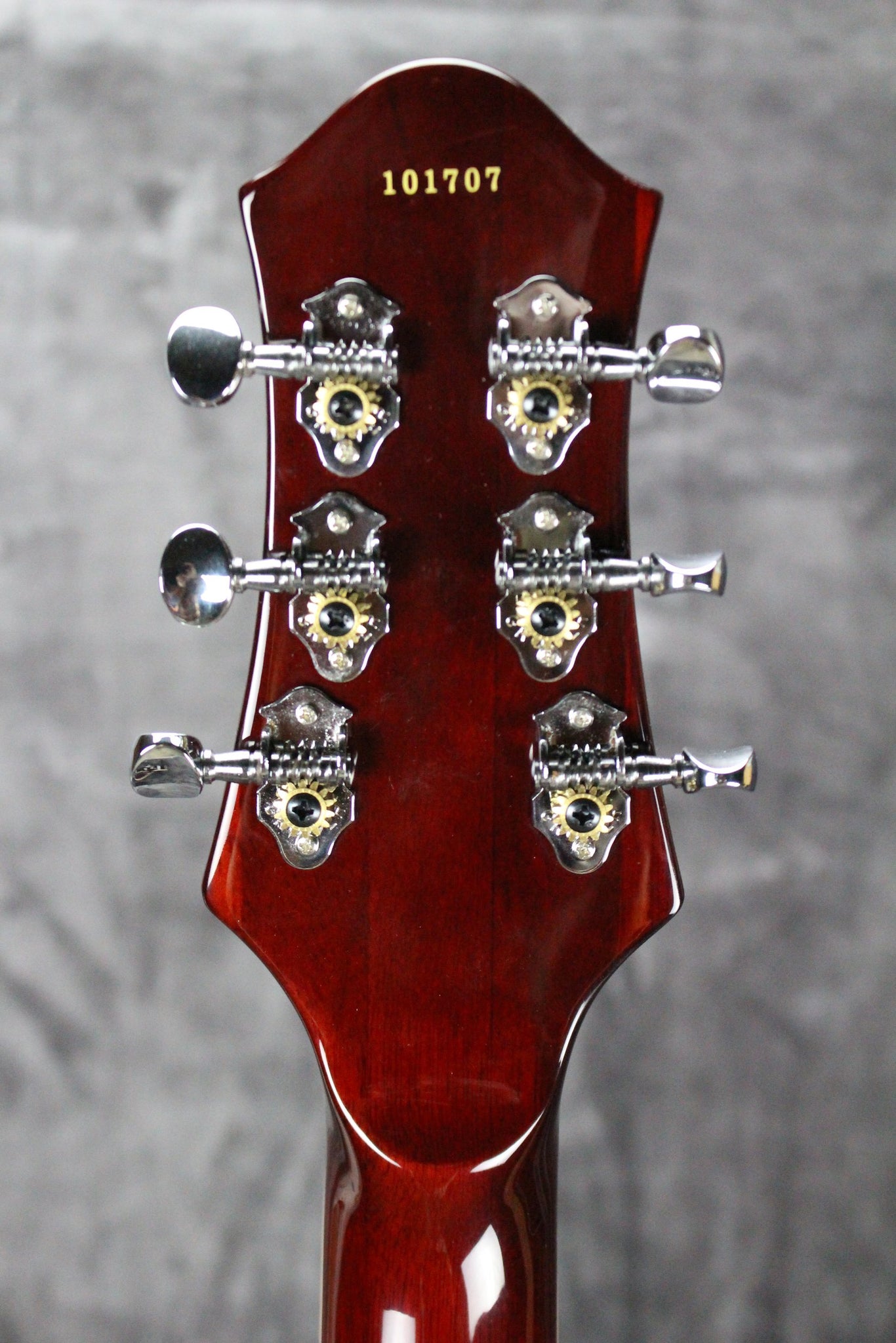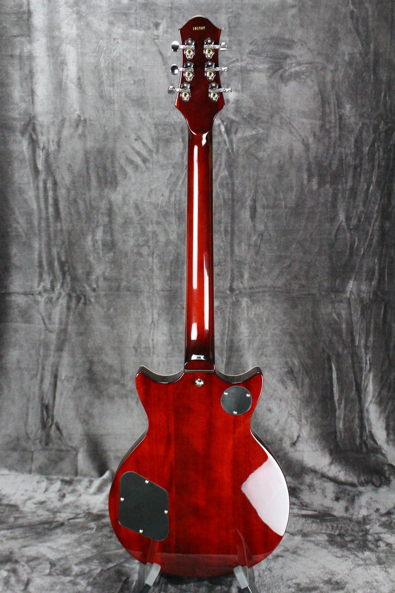 Body: Solid Mahogany with a carved Maple top finished in a gloss metallic red.