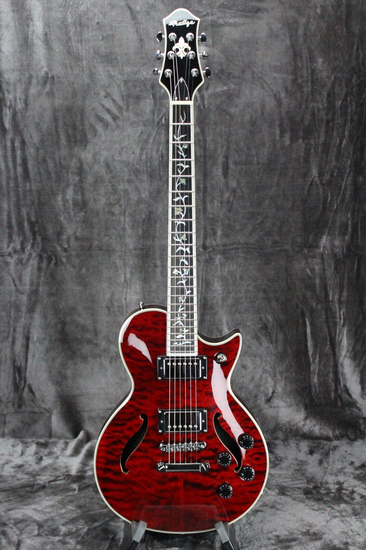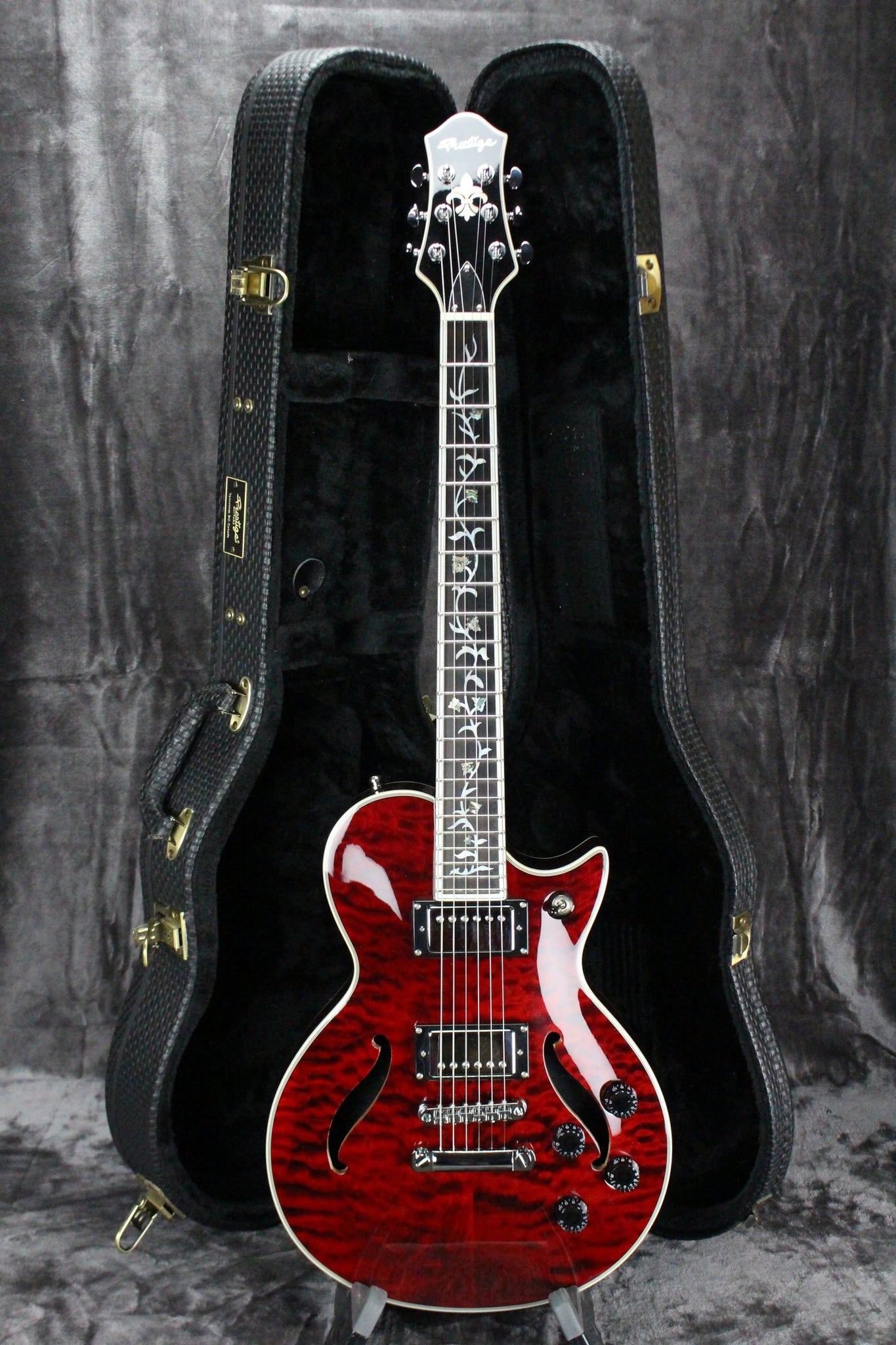 Body: Solid Mahogany with a Solid Carved Maple top, cream binding, finished in a red quilted gloss.