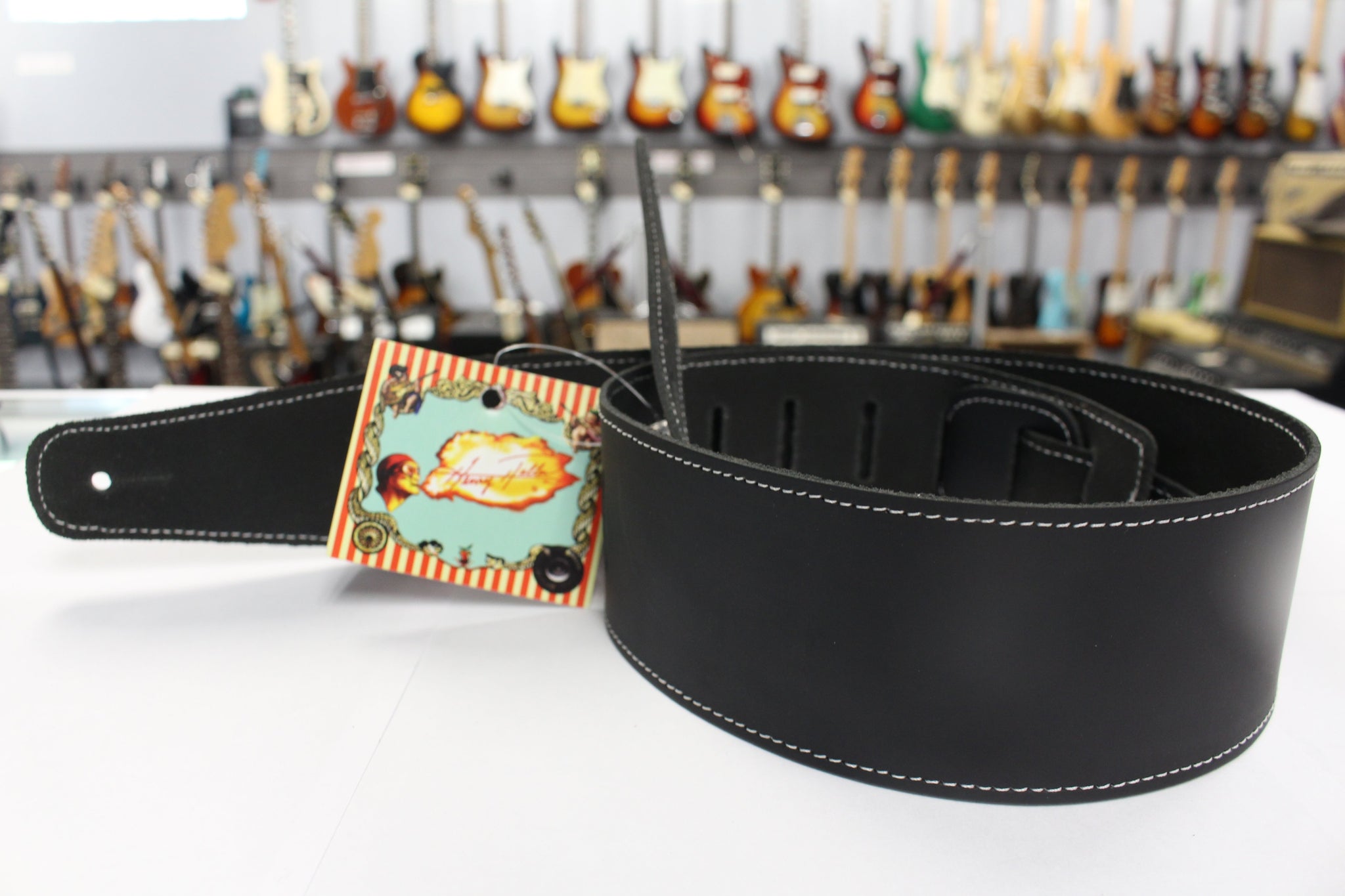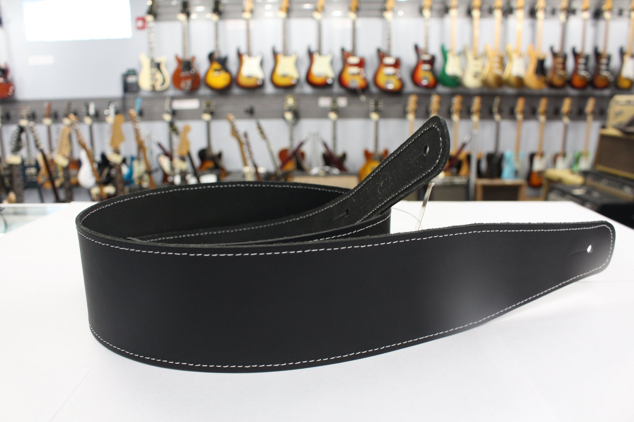 This is a Henry Heller guitar strap model # HBL25 BLK/BLK. It is black leather with black stitching and the Empire Guitars logo.
