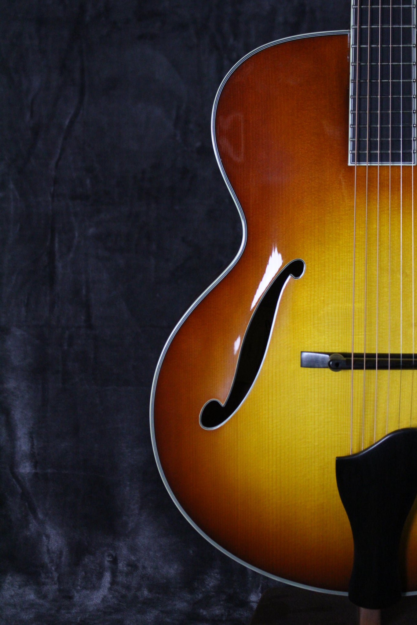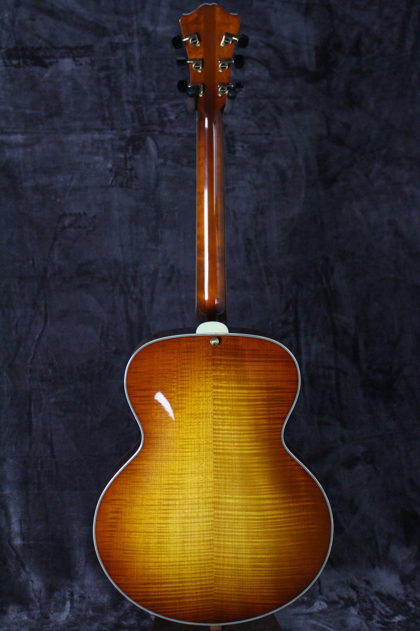 The solid spruce top and solid handcarved maple back and sides contribute to the guitar's exceptional resonance and projection, providing a well-balanced, full-bodied sound that will captivate both the player and the audience.