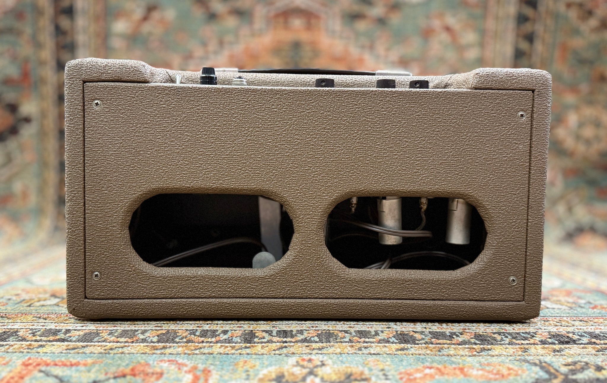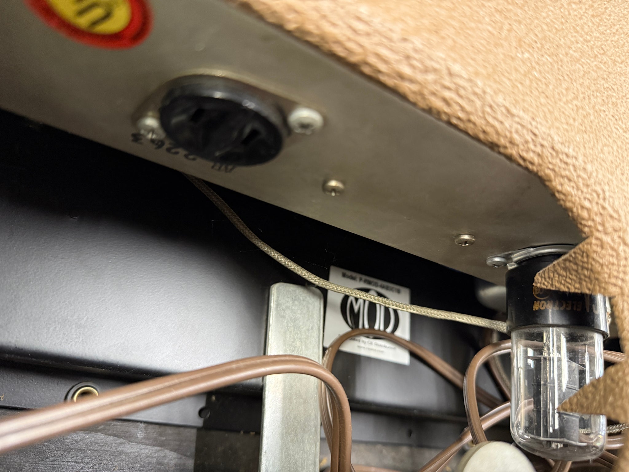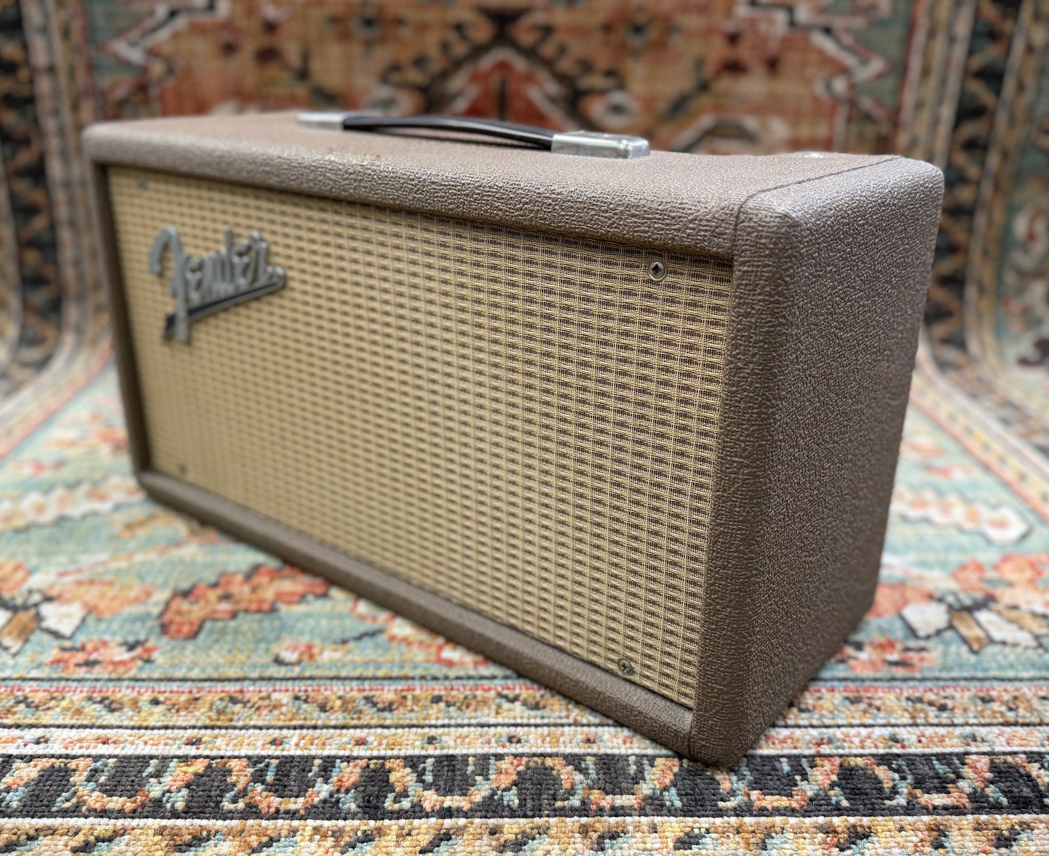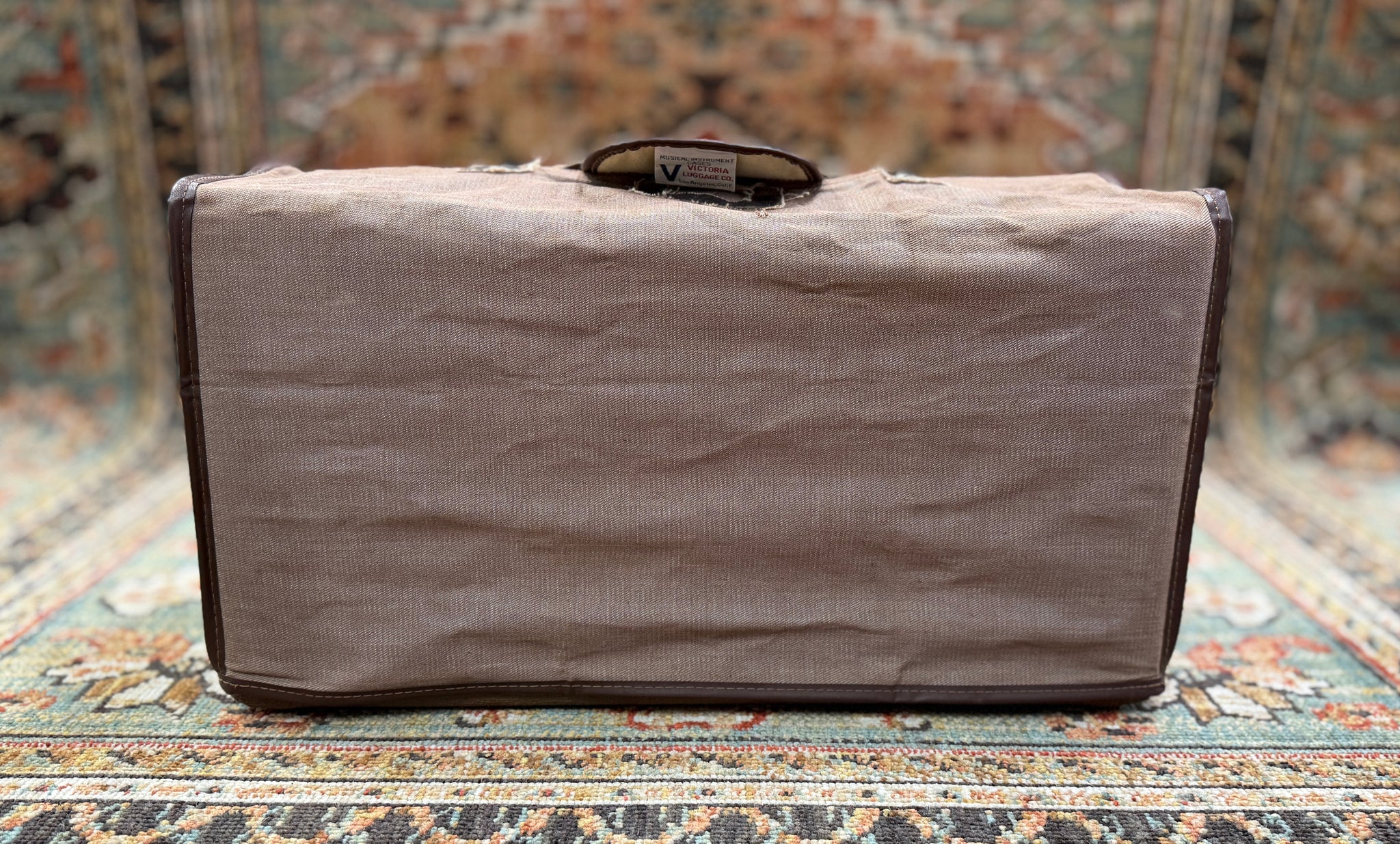 This Fender Reverb Unit, with a tube chart indicating "ME", dates to 1963. The original output transformer has been replaced and the reverb tank has also been replaced with a correct spec Mod tank. This unit also comes with a very rare original Victoria Luggage Co. cover.