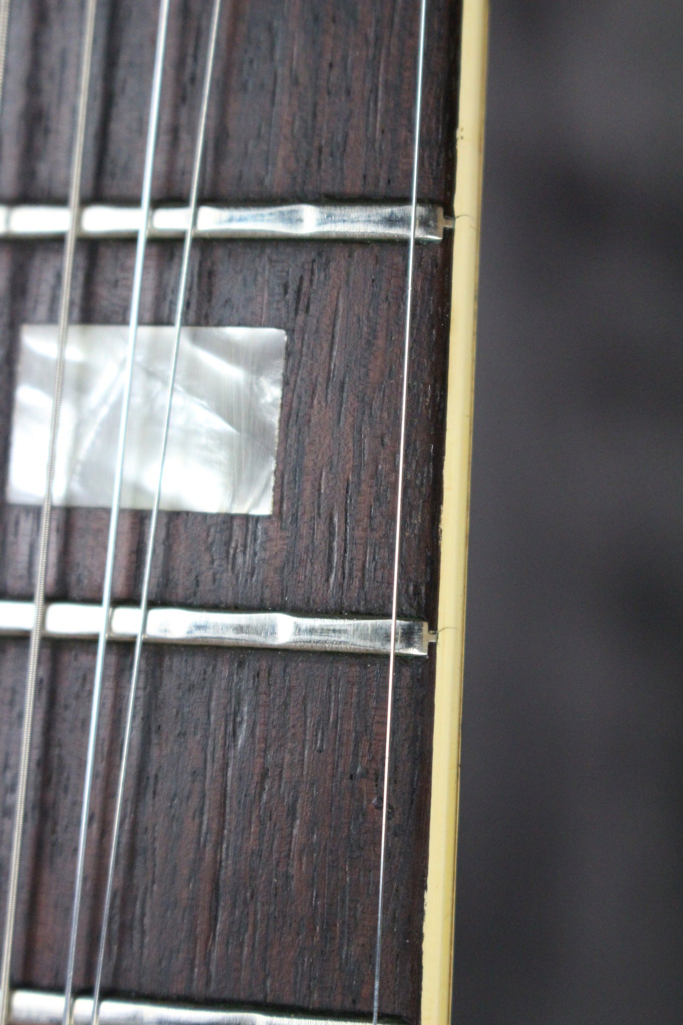 Neck: The mahogany neck joins the body at the 19th fret, has a bound rosewood fingerboard with block inlays, 22 frets, 24 ¾” scale length and 1 9/16” nut width.