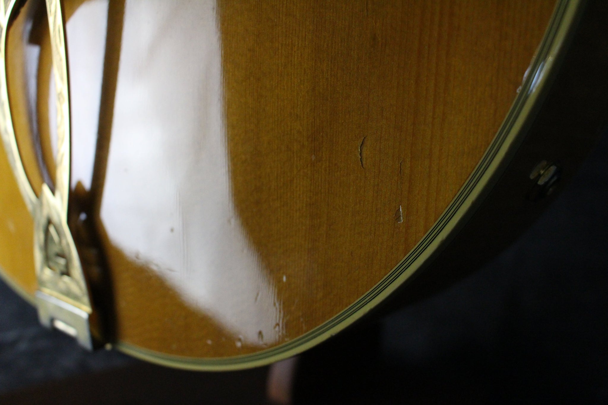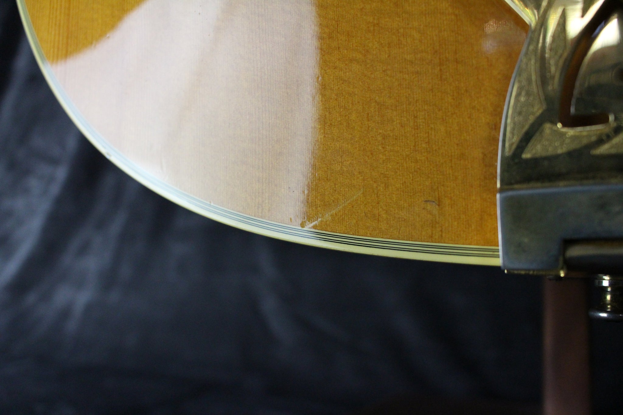 Cosmetics: This guitar is in very good shape. The guitar has light tarnishing on the gold hardware consistent with age. There is some wear spots on the back of the neck heel where the joint meets the body. It has light surface scratches and small indentations on the body. The back of the neck is clean, and the frets show minimal wear. The back has light buckle rash. Overall, this guitar plays very well and sounds fantastic.